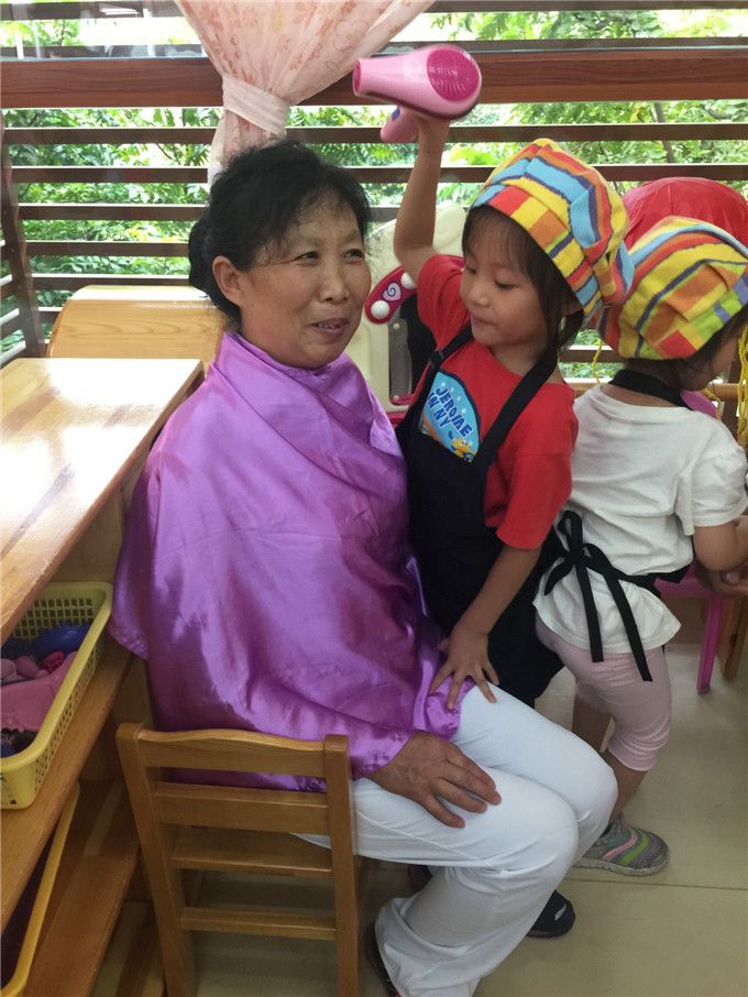 造型师晨岚和瑞怡正在给奶奶烫头发,看!把奶奶打扮得多漂亮呀……
