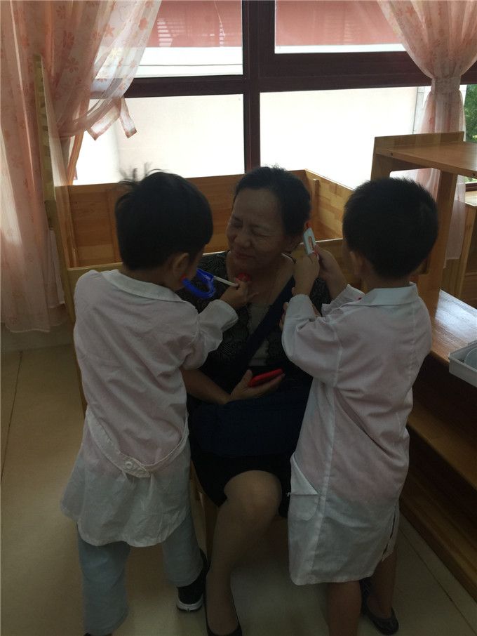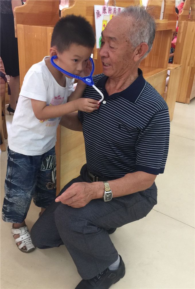 “爷爷,我是医生,来给你检查身体啦!”家瑞小朋友拿着听诊器仔细地听着。