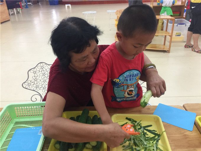 火火和奶奶正在认真地削着黄瓜,奶奶不时地提醒火火注意安全;