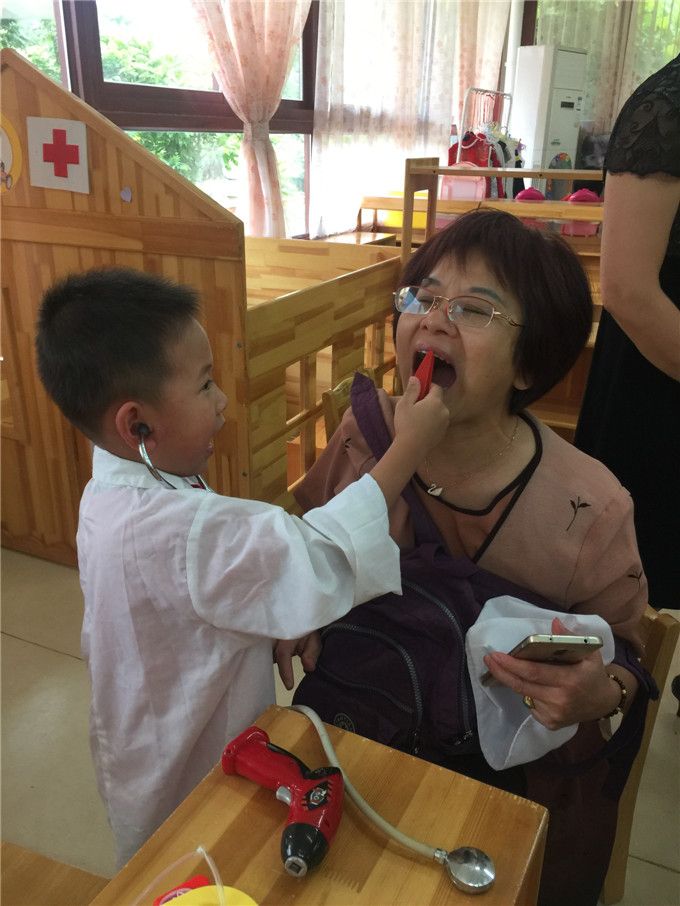 “奶奶,我给你检查一下牙齿,你有蛀牙,要记得刷牙哦!”果果小牙医认真地帮奶奶检查牙齿。