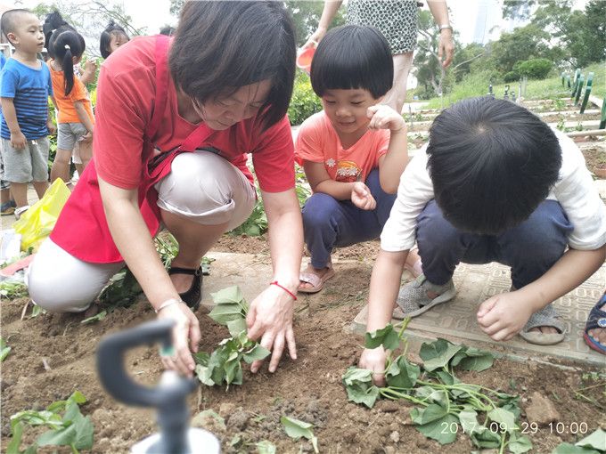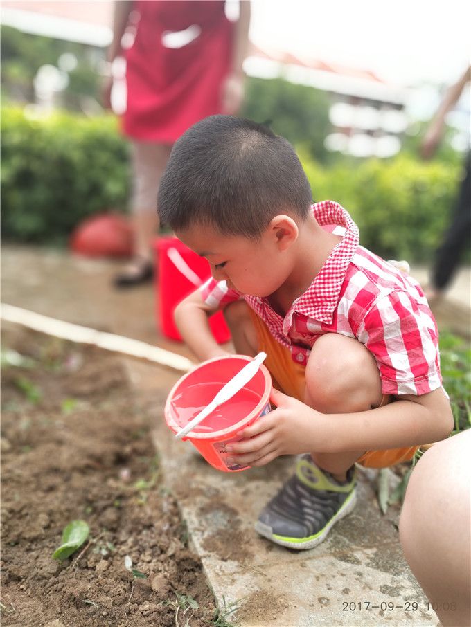 经过小组商讨之后我们开始行动了,孩子们自主分工,有的拔杂草、有的种小菜苗、有的负责浇水……