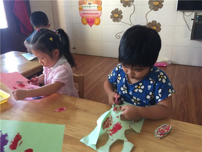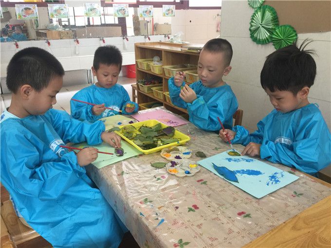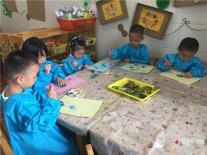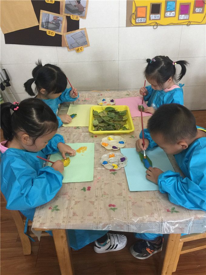 他们用笔沾满水粉颜料,在树叶表面涂上颜色,将树叶防放在不同颜色的卡纸上轻轻按压,揭开时留下树叶的印记。哇……树叶的叶脉都清清楚楚地印在纸上了呢!
