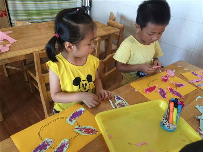 一部分孩子在花环上添加细细的线条,用彩笔画出大大小小的果子;另一部分孩子则将树叶固定在彩带上,做成一个个漂亮的花环,戴在头上、脖子上,开心极了!