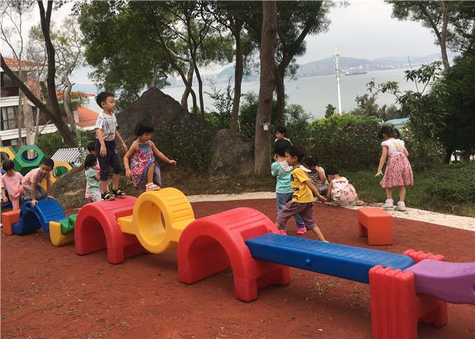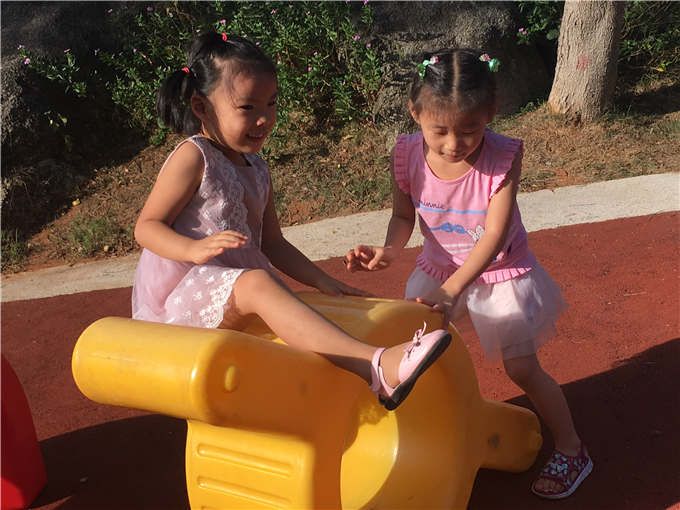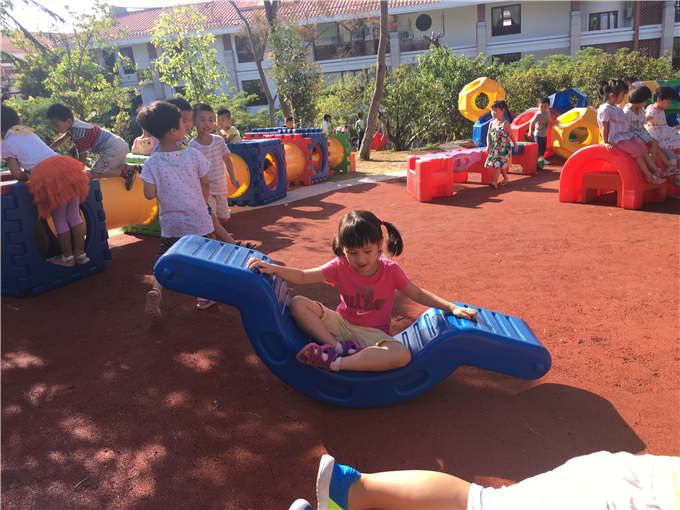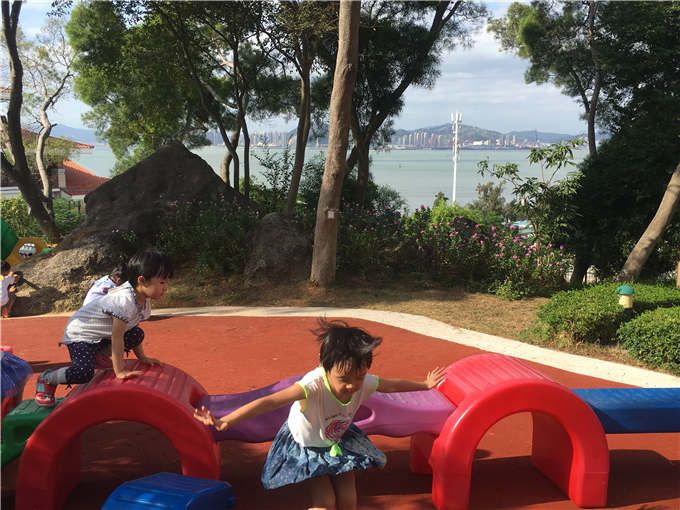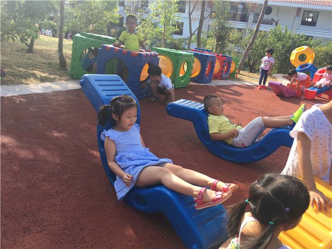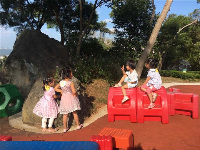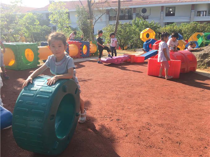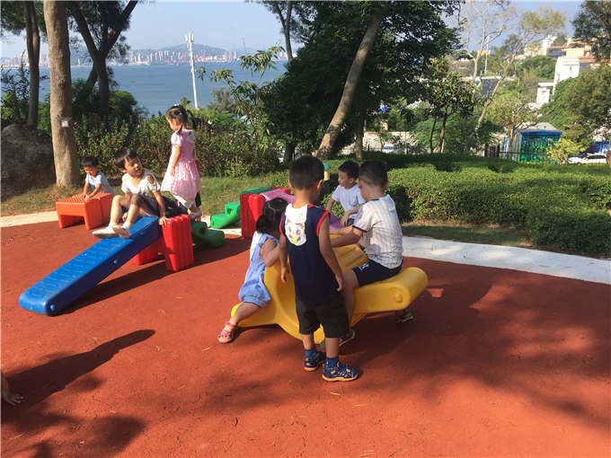 坡顶橡胶垫上的大型组合器械是中七班宝贝们新近重点挑战的运动项目之一。如何玩、如何拼,全凭小娃娃们自己做主!老师们似乎总在一旁观战,偶尔提点小建议,鼓励、肯定的眼神与话语,就像秋天的朝阳一样暖暖撒进孩子们的心田……
