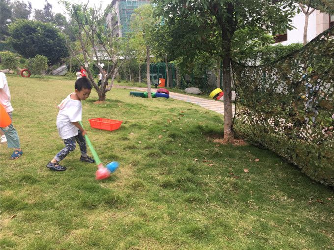 泽宇则拿起球杆“看我的,小景你来投球,我来帮你捅出来!”“我也来帮你!”凯凯和彤彤也拿起了球杆,孩子们玩的不亦乐乎。