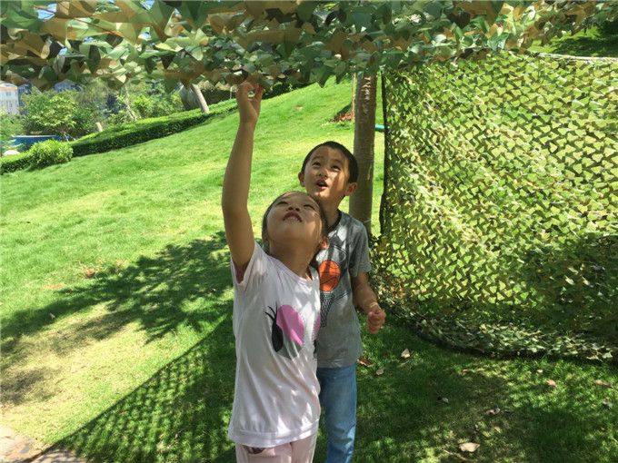 山坡上,孩子们不受空间的限制,自主地与材料产生互动,与同伴产生互动,与环境互动,两张迷彩网被孩子们挖掘出各种玩法,下一次“天罗地网”又可以变出什么新玩法呢?让我们一起期待吧!