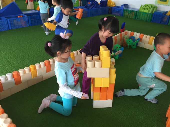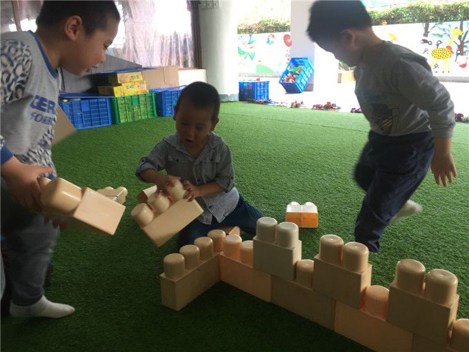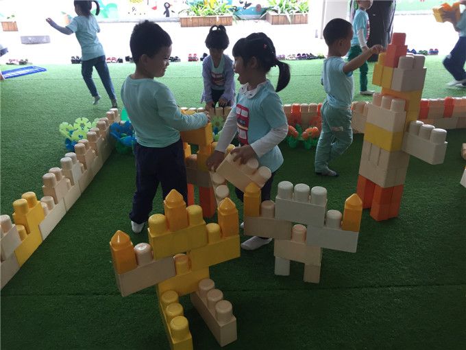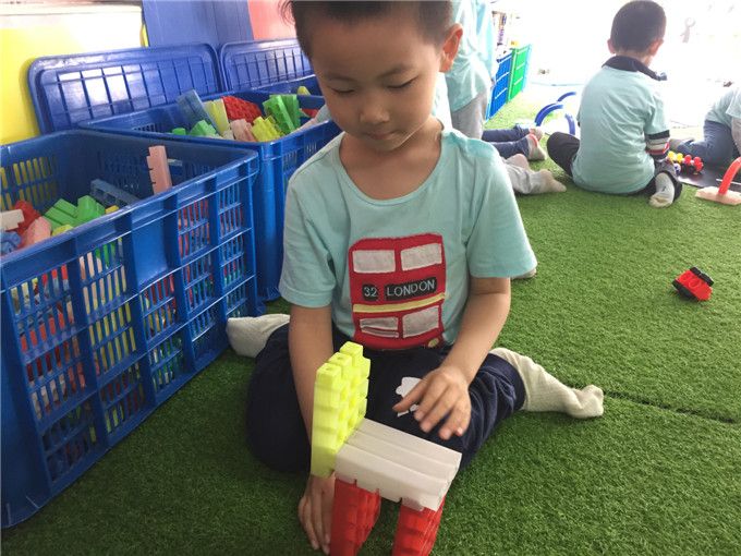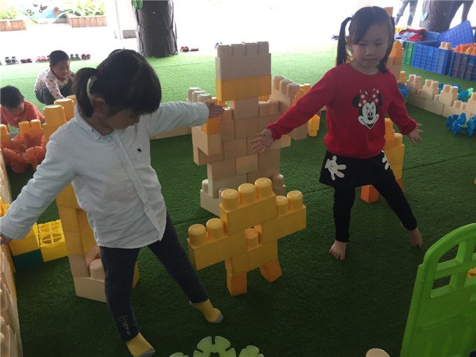 “我们一起搭围墙吧,我可是搭围墙的高手!“上面来个黄色的搭配不错”。活动一开始,围墙组的小朋友们动起手开始为机器人城堡搭建围墙了。