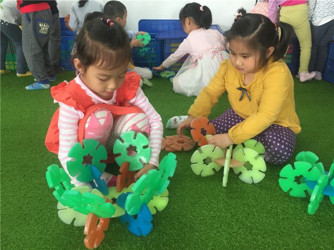 “来来来,我们来拼一些花吧。”“机器人站那么久了一定脚累了,搭几把椅子让机器人坐吧。”拼搭好机器人小朋友们又为花园增添了花花草草,和各种便利设施。