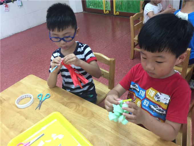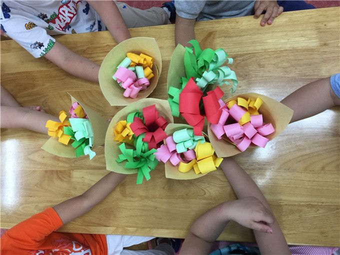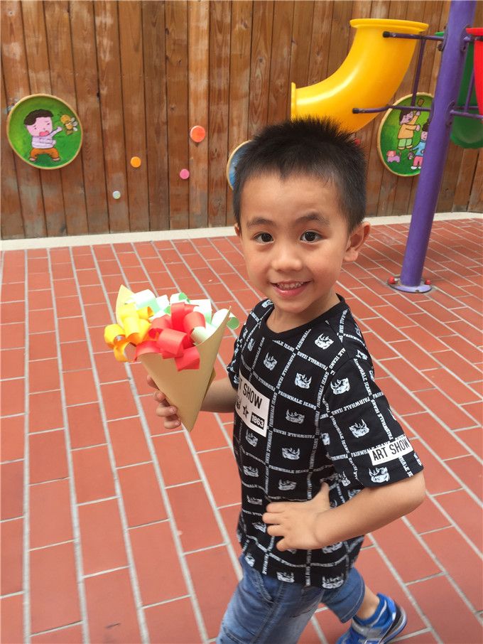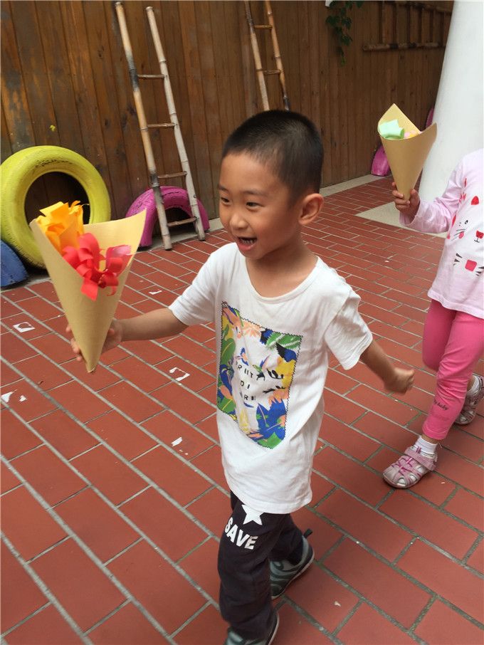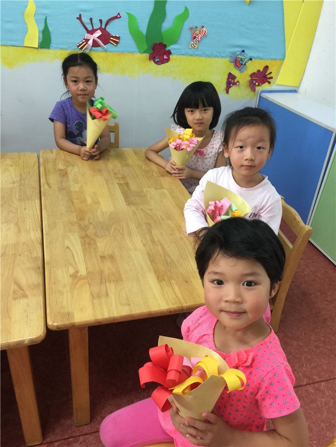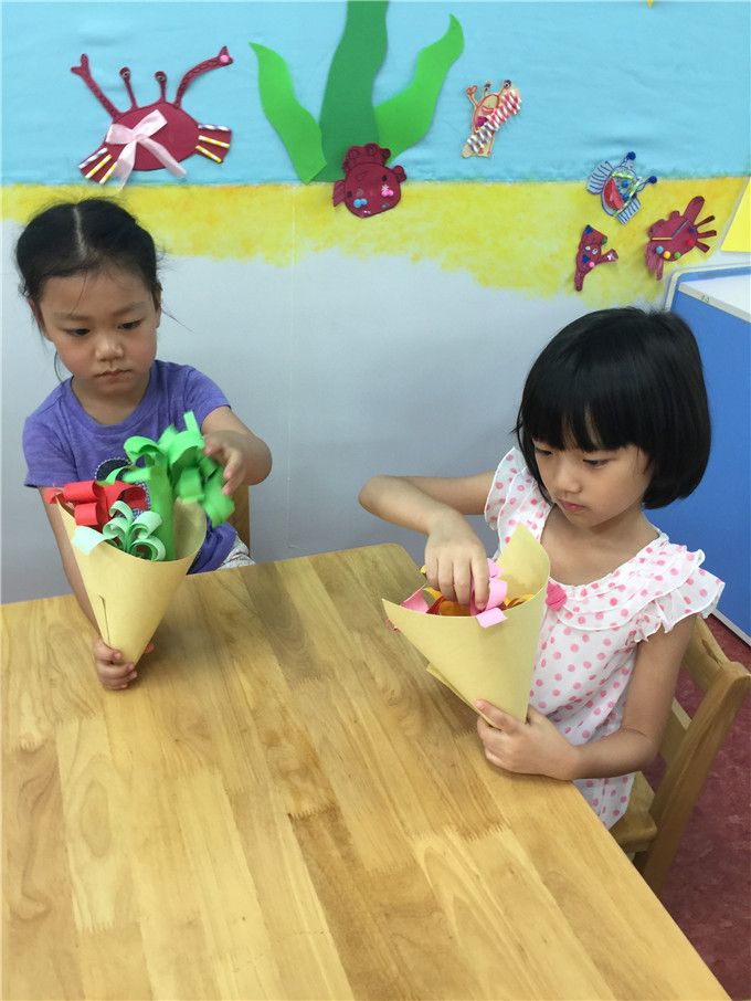 “粉红色是我妈妈喜欢的颜色,我要给她做一朵粉红色的花。”“我的妈妈和我一样喜欢彩虹,所以我要做一束五颜六色的花送给妈妈,她一定会很开心的。”宝贝们你一言我一语地议论着,早已按捺不住内心的激动,跃跃欲试。