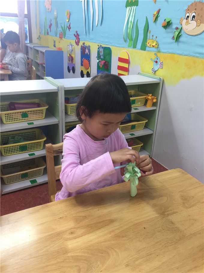 神秘道具出场了——吸管!取一片花瓣缠绕在吸管上,卷卷卷,噔噔~一片弯弯的花瓣就做好了。宝贝们聚精会神地制作着。