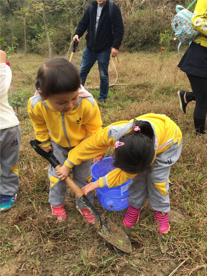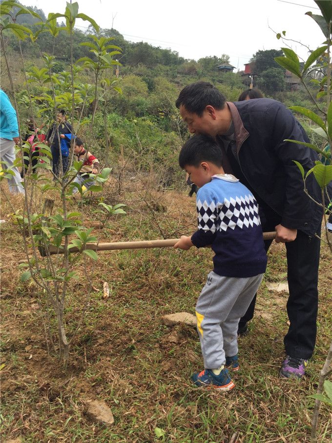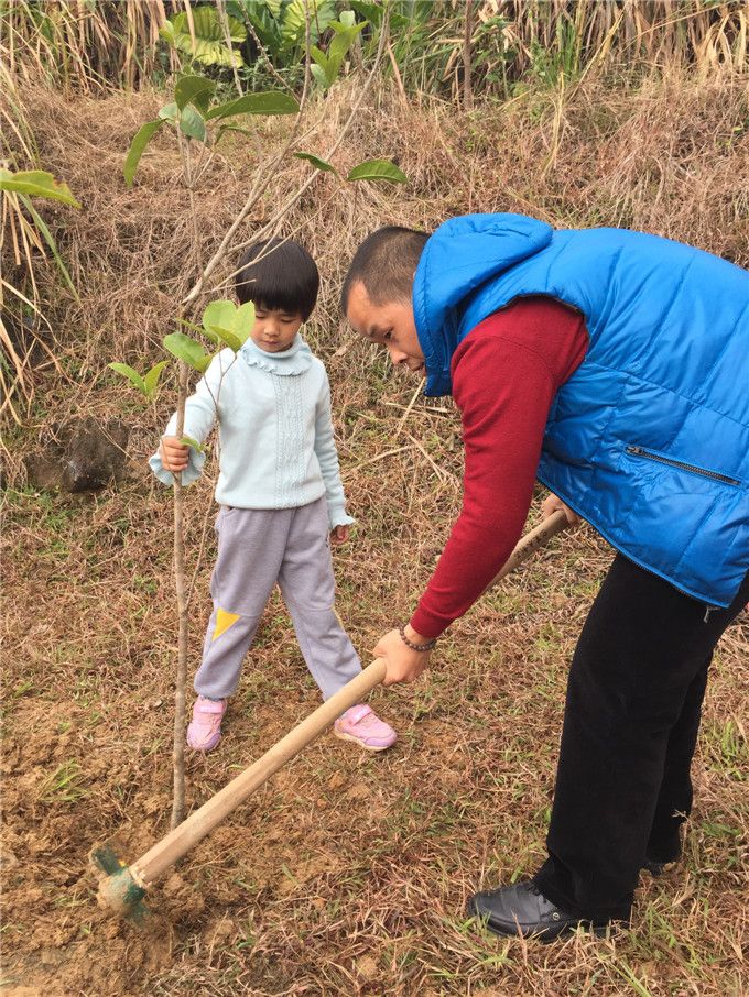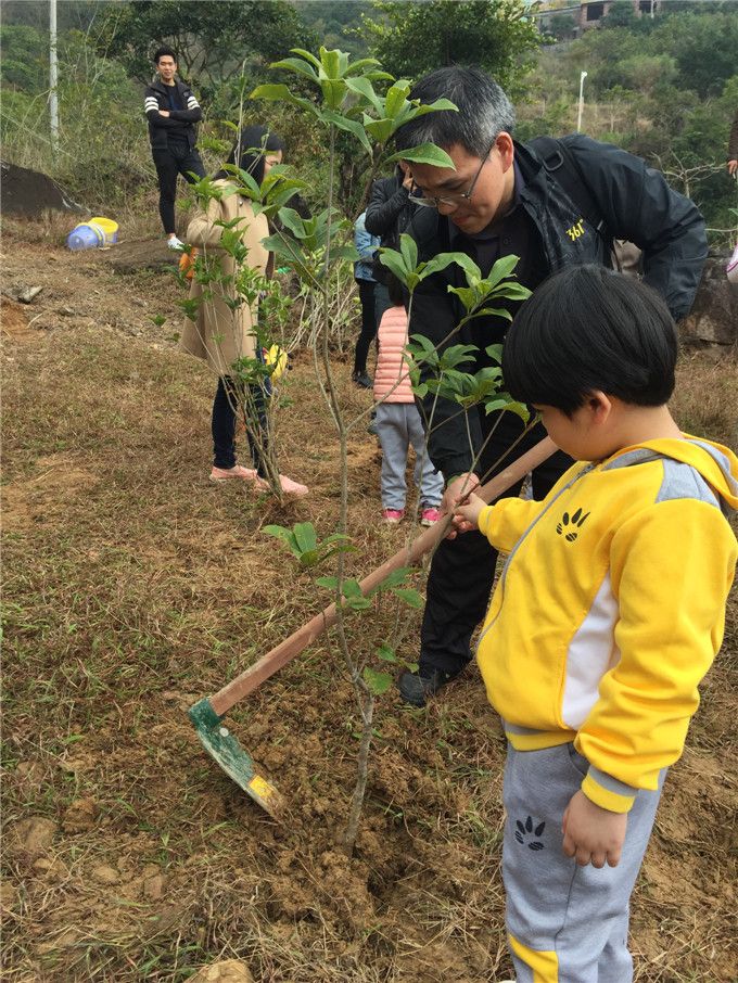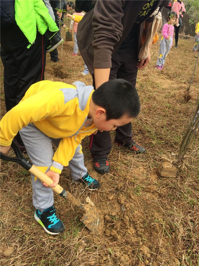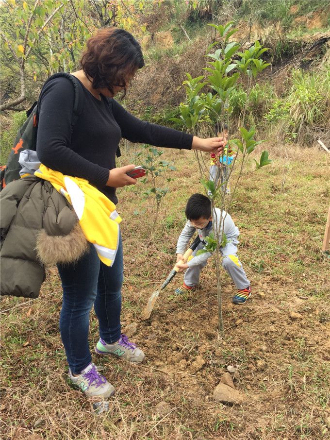 到达植树地点,植树活动正式开始了。小朋友纷纷领走自己的小树苗和爸爸妈妈一起合作种植“亲子树(桂花树)”。看,有的拿起小铁锹开始挖洞,有的把树放进挖好的洞里,再用泥土盖起来,最后,再给小树苗浇上清甜的河水。由于前两天降雨,土地有了雨水的滋润变得更加柔软,为我们的植树带来了便利。