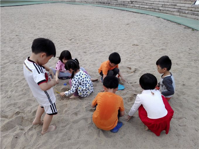 休息时间到了,精力充沛的小朋友怎肯静静坐着?抓紧在沙坑里做个蛋糕,自娱自乐玩个catch游戏。