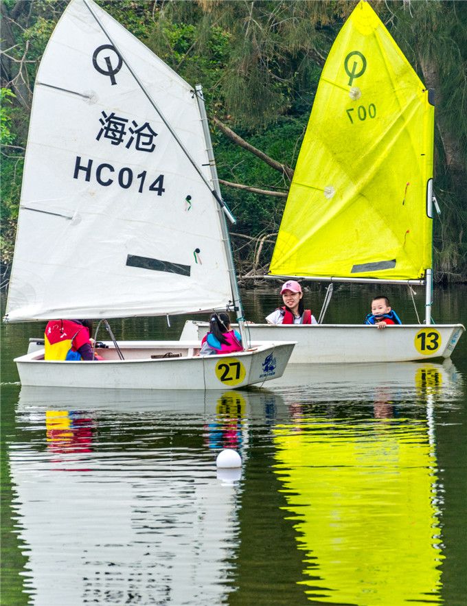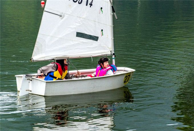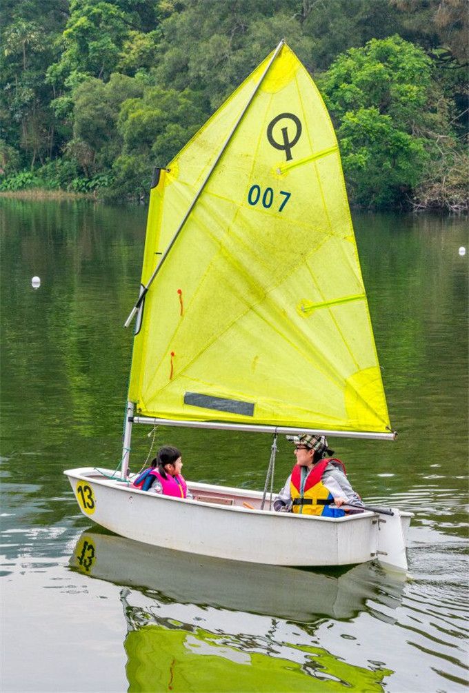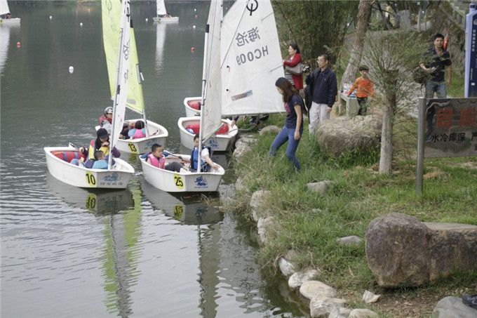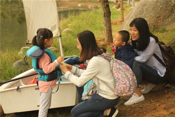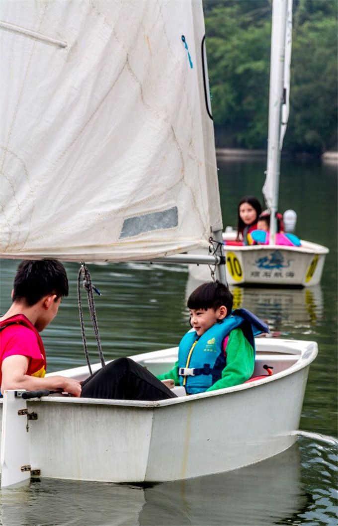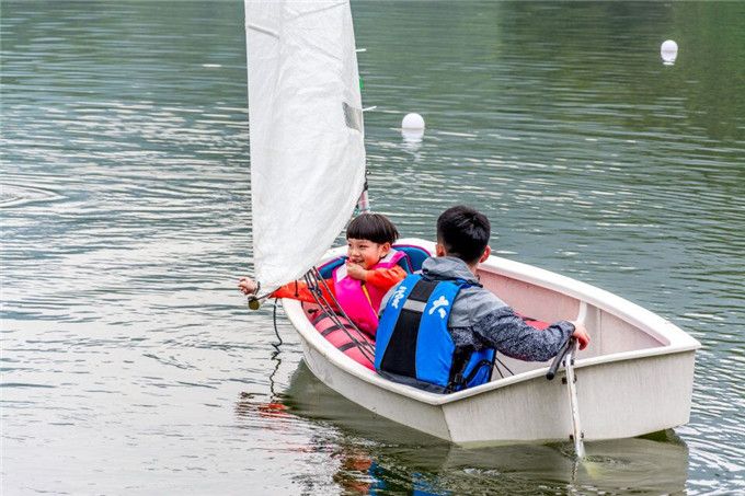 在水库堤岸上看到停靠着小帆船,小朋友们顿时欢呼起来:“那就是帆船,上面那个大大的旗帜就是帆。”“帆船和我们坐的轮船不一样哦!”“终于可以坐上帆船啰!”孩子们你一言我一语地说着,兴奋极了,思源谷回荡着孩子们的欢声笑语。