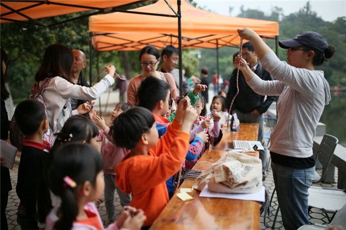 瞧,一旁等待的小朋友正认真的向大学生哥哥姐姐学习如何简单地扎绳索。