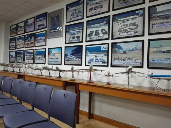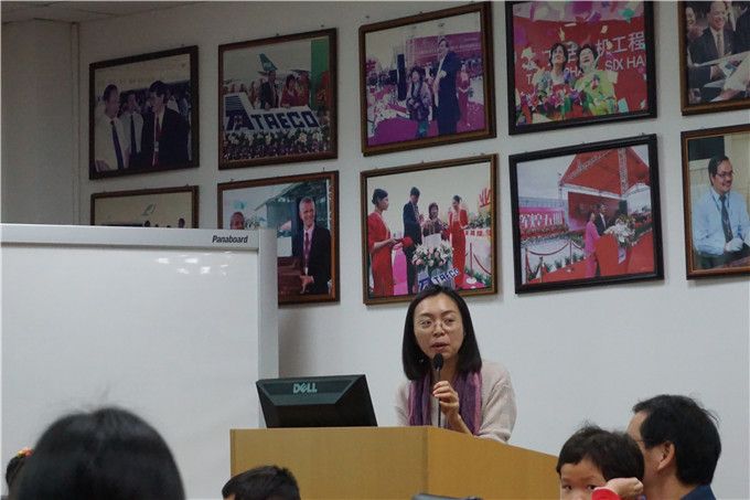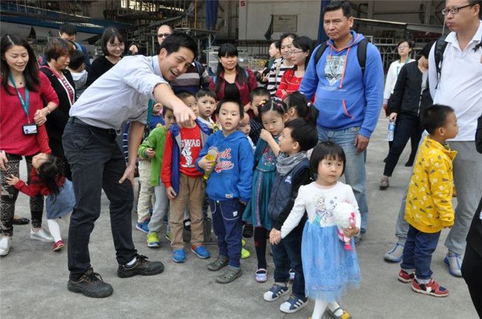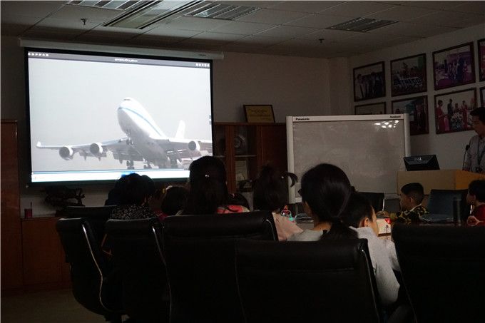 在工作人员的带领下,大家迈开大步,纷纷向会议室走去,小朋友们坐在会议室认真听着讲解员为我们讲述太古飞机的工作任务,并进行有趣的知识问答,“原来飞机都是到这里来修理和喷漆的呢!”“叔叔阿姨好厉害,可以组装这么大的飞机!”“快看这架飞机有两层呢!”