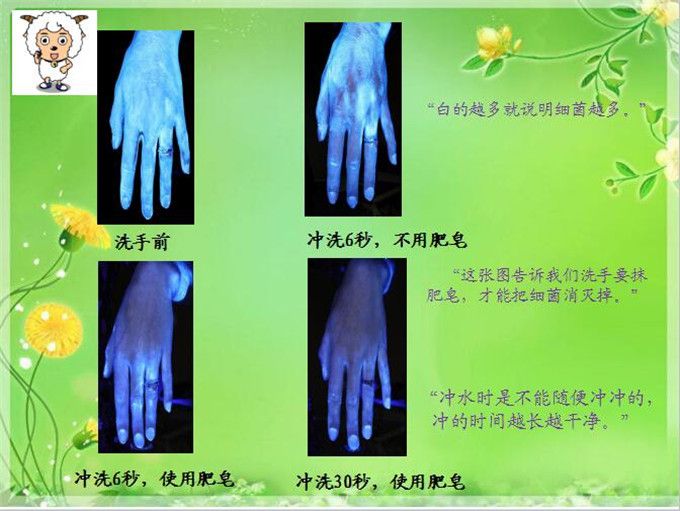 让我们一起看看在仪器拍摄下的手。仪器拍出来的这些白白的就是细菌。这张图告诉我们什么道理?“白的越多就说明细菌越多。”“这张图告诉我们洗手要抹肥皂,才能把细菌消灭掉。”“冲水时是不能随便冲冲的,冲的时间越长越干净。”除了注意要抹肥皂,多冲水,我们还要用正确的方法来洗手才能洗得干干净净。