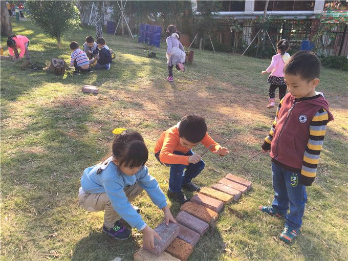 你瞧!草地上的孩子们就地取材玩起了独木桥的游戏。