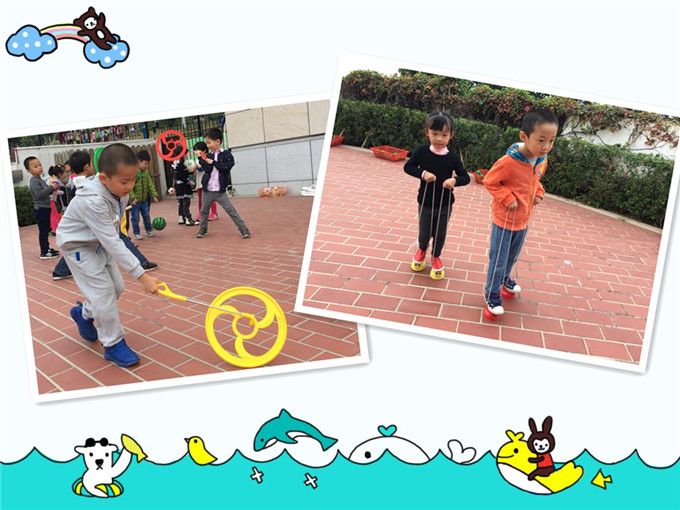 早操场地上的孩子们一样玩得欢笑声迭起。拍皮球、丢沙包、投篮、风火轮、踩高跷……项目种类多得无法一一列举。