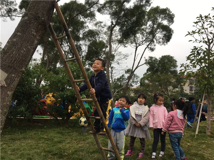 山坡上的游戏还不止这些呢?曹宝宝的梯子早已架在了树杆上,我连忙问他:“孩子孩子你这是要去哪里?”“老师!我想看看从这长长的梯子是不是能够爬到云里”。孩子们在户外游戏中也能如此诗意。