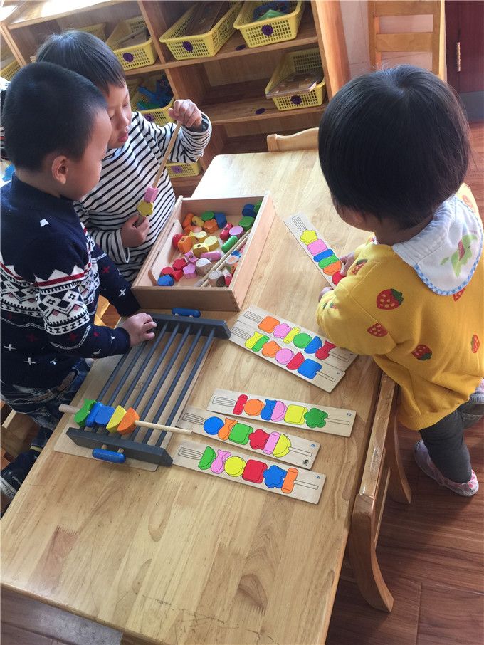 卖“烤串”咯!要根据客人的“点单”要求现串现烤,要按照颜色、形状、顺序手协调地串起来,足够的细心、耐心少不了。