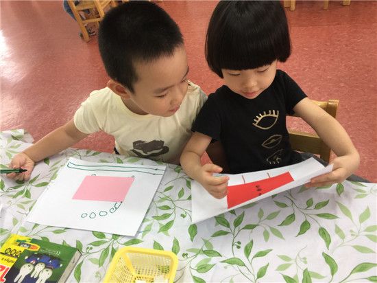 “你看你看,长方形宝宝抱着他的妹妹,我给他们画上眼睛和嘴巴,于是他们就变成了一个机器人。”睿睿兴奋地和杨杨分享着,“我们家的房子就是正方形宝宝和三角形宝宝手牵手变成的。”“你们看,我把圆形宝宝变成了另一个我……”