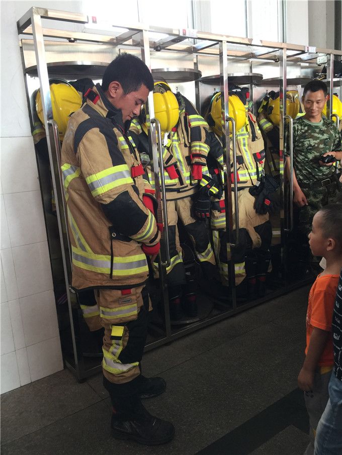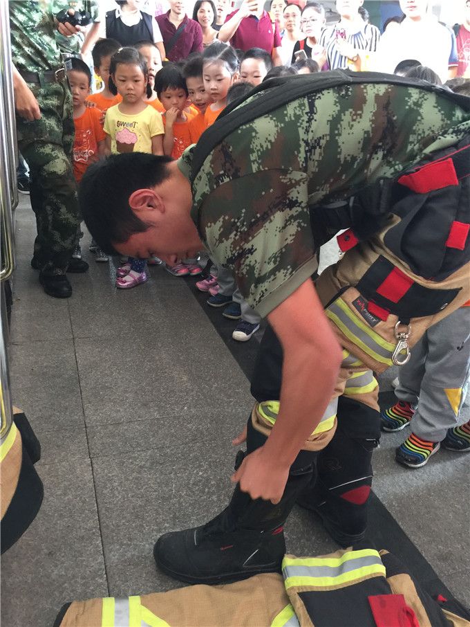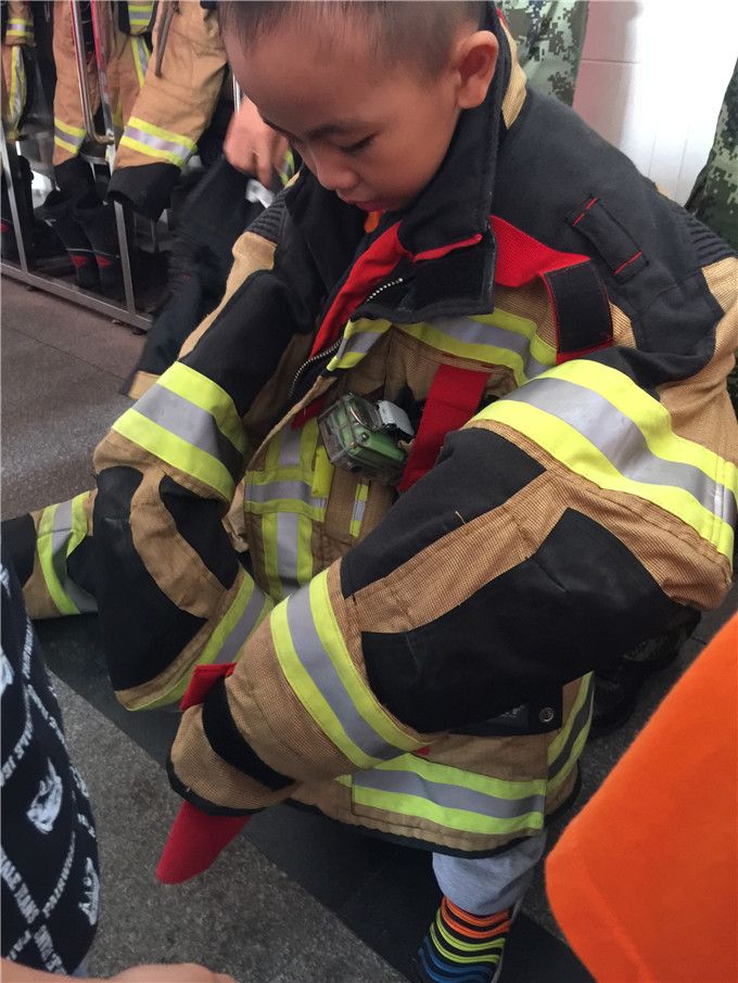 接着,消防员叔叔带我们认识了他们的衣着装备:有防护头盔,厚厚的防火服,重重的钢板鞋,氧气瓶氧气罩等等。你知道吗,这些装备加起来约有30公斤重哦。哇,消防员叔叔的衣服真神气,我也好想试试。怎么样?我是不是很酷!