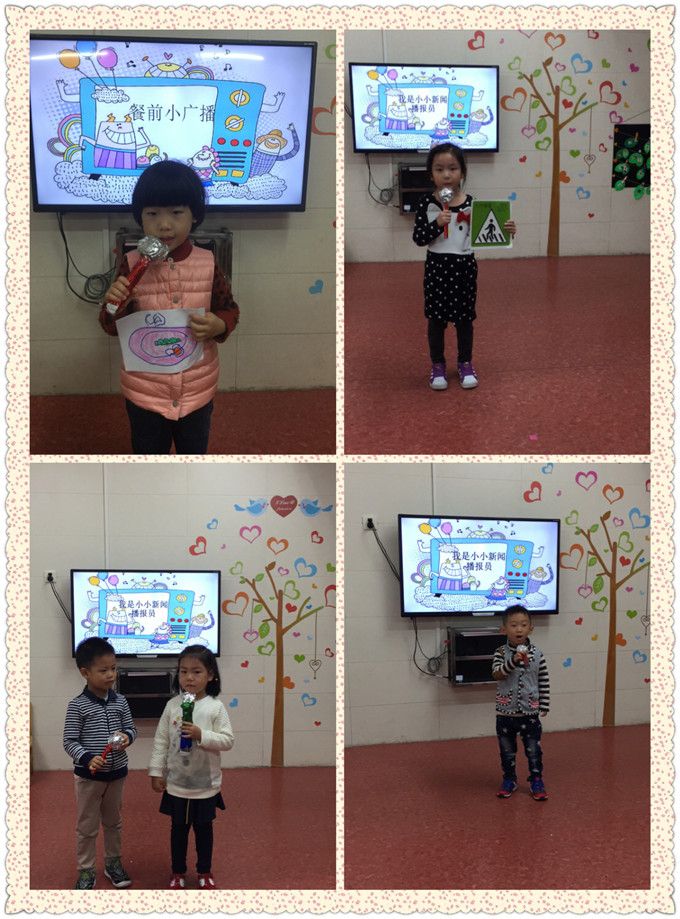 结束了这趟广播之旅,在回幼儿园的路上孩子们你一言我一语地与同伴分享着刚才自己的所见所闻,无形中对广播也产生了极大的兴趣。为此,我们班也开展了相关的活动——我是小小播报员。孩子们可以在平时进行 “餐前小广播”、“ 我是小小安全员”或者回家在爸爸妈妈的帮助下搜集新闻来幼儿园与小伙伴进行播报。这不,小播报员们正播报新闻呢。