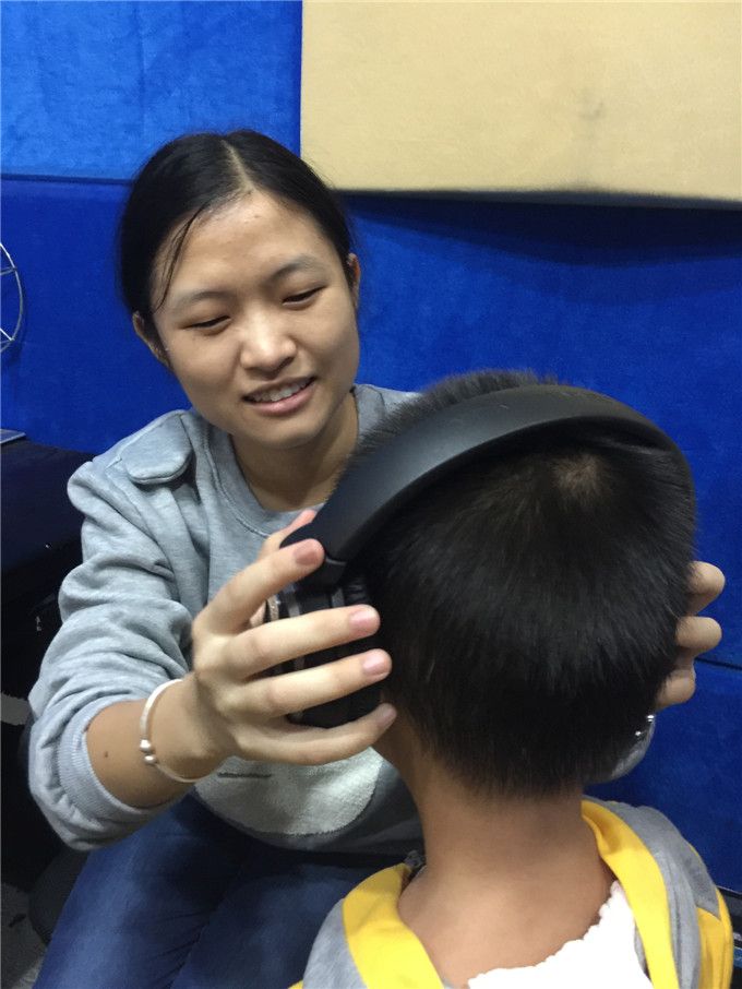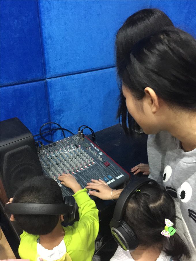 “咦,这个机器上面怎么有那么多按钮,是什么呀?”只听从编辑区传来了晖晖的声音“这个叫做操控台,是在控制声音的。”大学生姐姐耐心的一一解答着孩子们的问题。“你可以带上耳机自己动手试一试,看看声音有什么变化。”在姐姐的鼓励下,晖晖头戴耳机,手握操控台,俨然成了一个小小调音师。
