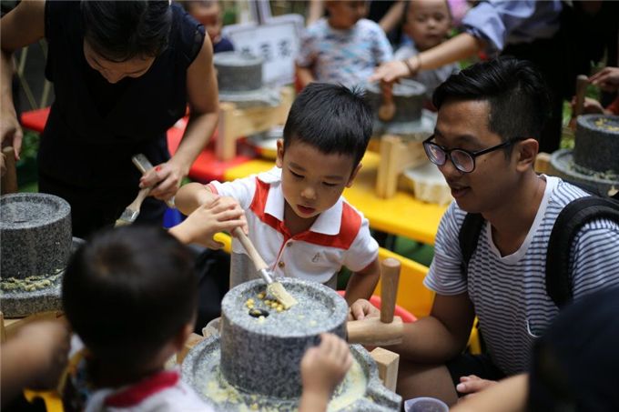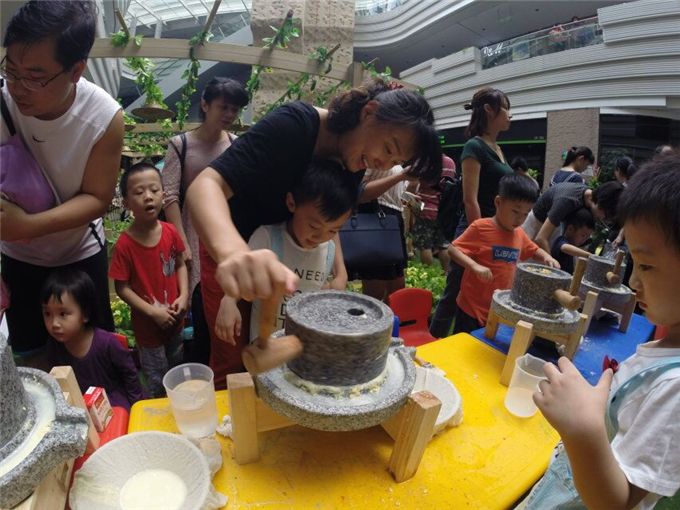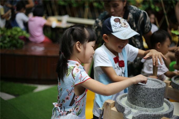“宝宝喝过豆浆吗?”“喝过呀,幼儿园就有啊!”“那你知道豆浆是怎么做出来的么?”“不知道……豆浆机?”别说是孩子,就是爸爸妈妈们,也已经远离石磨豆浆很久很久了。抓一把泡过的黄豆,舀一杯干净的清水,准备工作完成,开工。又要放豆子,又要磨,小手忙不过来啦。没关系,好朋友一起来配合。你放豆,我推磨,妈妈来加水,我们的豆浆流出来啦!豆子磨得又细又匀,看到的叔叔阿姨都夸我们磨得好。