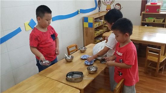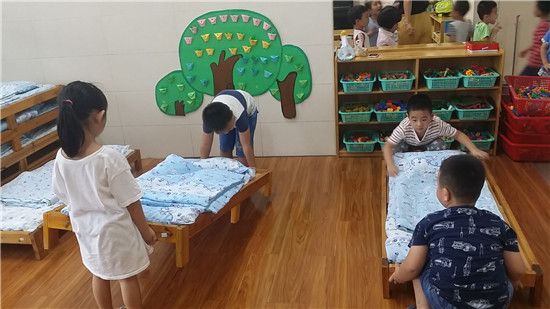 我们开始学习一些新本领,在老师的指导下每次户外活动前我们能很好地互相帮助同伴把垫汗巾垫好。这学期我们也开始学当小小值日生,协助保育老师做好餐前准备、餐后收拾整理桌椅、学习抬我们的小床铺。学折自己的小被子这也是我们成为中班小哥哥姐姐要学好的一个小本领,学习清洗自己餐点后的小杯子……。