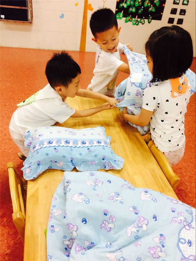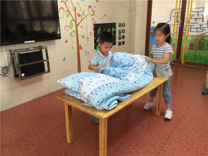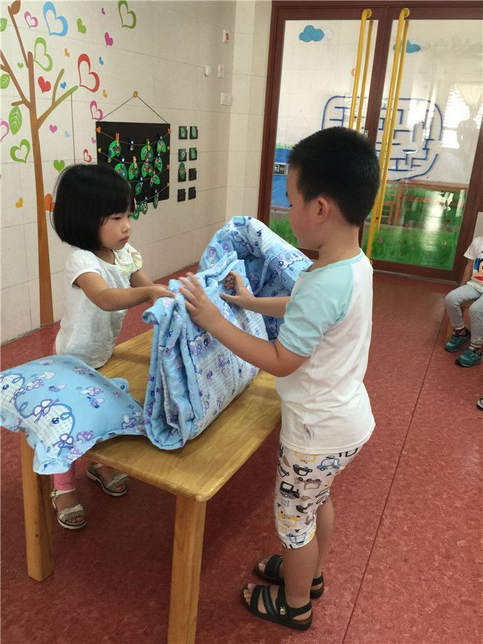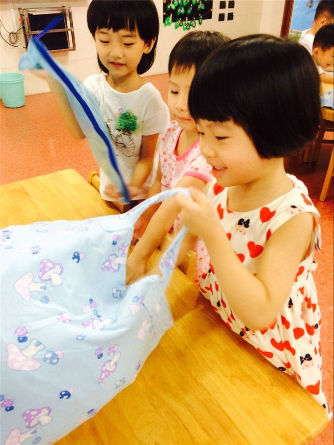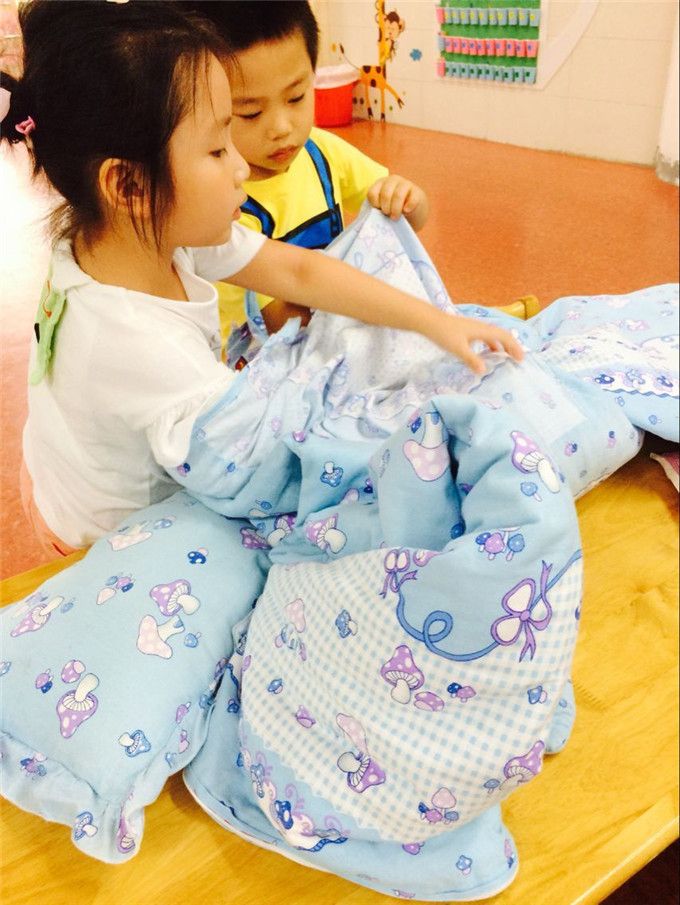 看到老师打包成功,大家都跃跃欲试。打包被子这个工作对刚上中班的小朋友来说,是具有一定的难度的,但是请了几个小朋友都能成功的将被子打包好,中二班的小朋友太能干了。