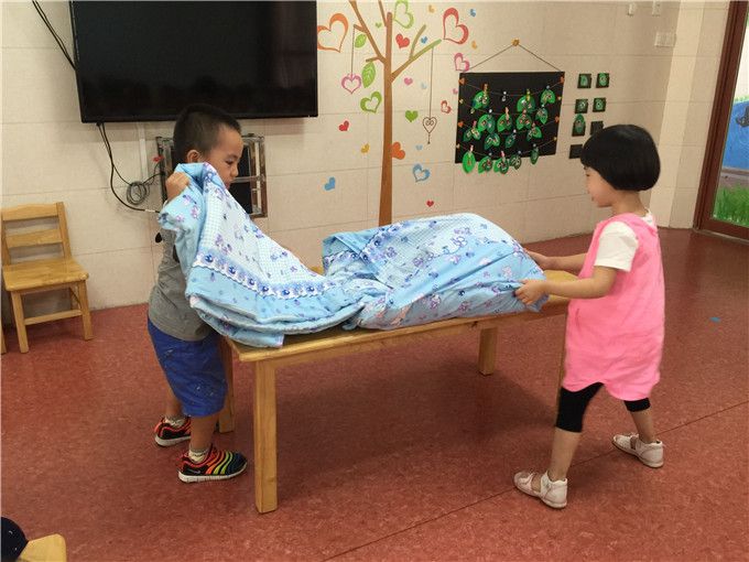 最后“打包被子大赛”正式开赛,老师将小朋友分成两两一组。卧室里一片热火朝天的景象,不一会功夫,小朋友就把被子打包好了,成果显著哦!看着已经打包好的小朋友其他小朋友也加快了手上的动作,不一会全班小朋友的被子全被打包成功。孩子们看着自己的劳动成果脸上洋溢着开心的笑容,中二班的教室传来阵阵笑声!