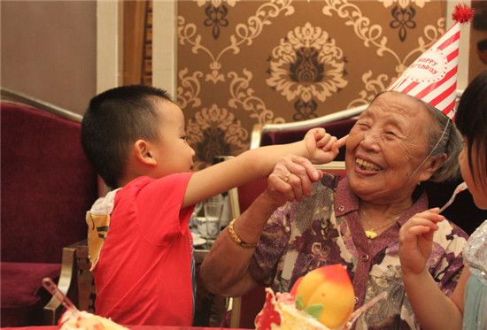 看这一片喜庆的景象,倪倪小朋友为太奶奶过90岁生日,倪倪调皮地把蛋糕涂在太奶奶脸上,把太奶奶逗得眉开眼笑,太奶奶又年轻了呢!