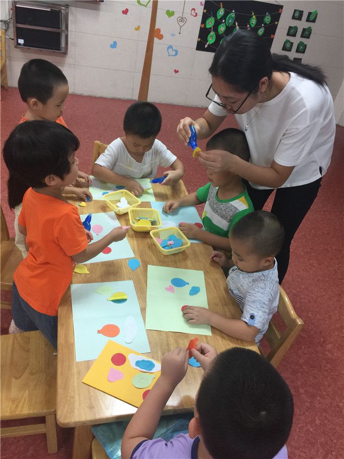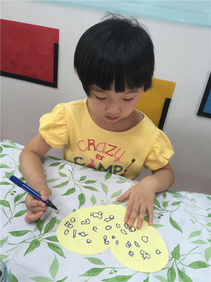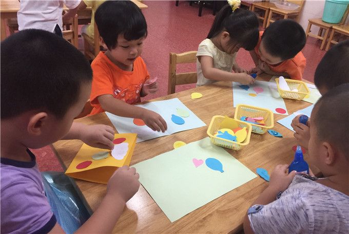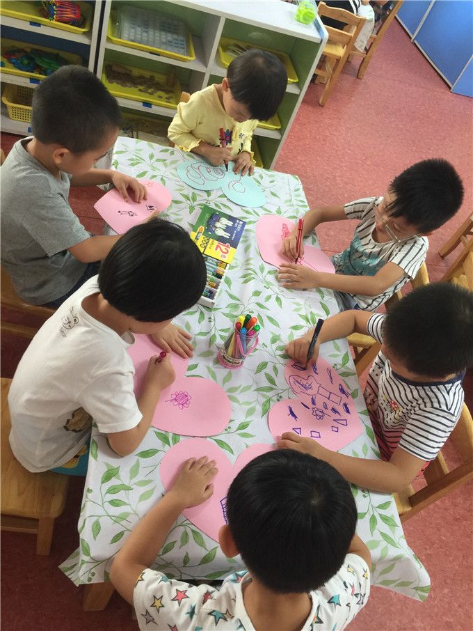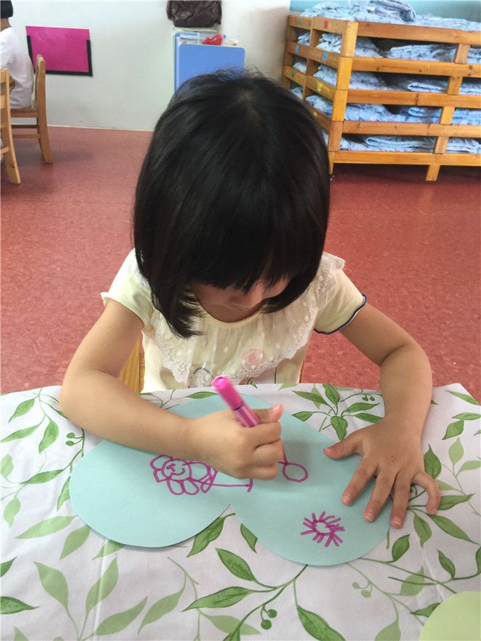 瞧,另一边的宝贝们也在,虽然爱心贺卡的制作具有一点小小的挑战性,但却不能阻止小朋友们的热情。原本稚气的小脸上也多了一份严肃,仿佛在说“让你瞧瞧我的厉害。”
