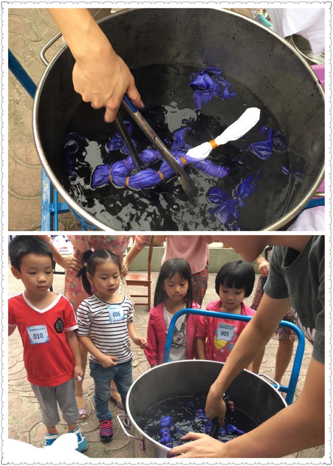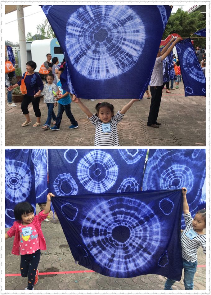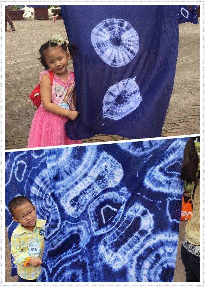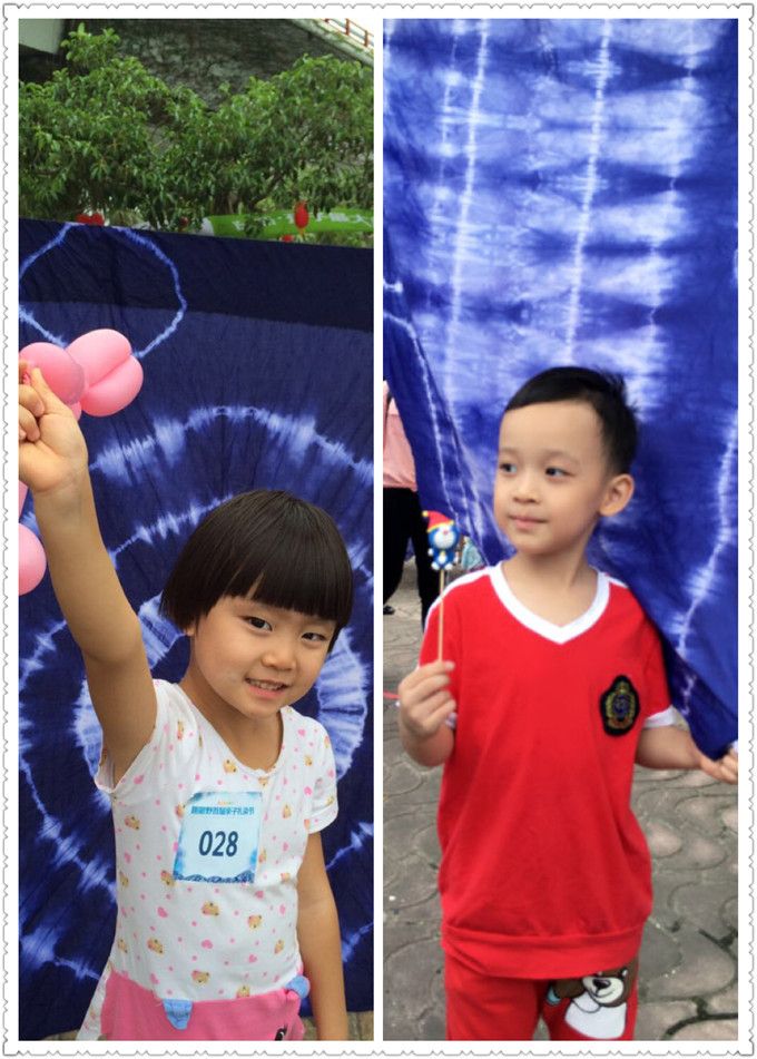 煮染了半个小时,在等待的时间里,小朋友在游戏区尽情的玩耍。有的玩套圈圈、有的玩转呼啦圈、 有的玩跳房子。作品煮染好了,展开一看,蓝底白花,古朴清纯,美丽的图案令大家眼前一亮,心旷神贻。大家小心翼翼地把布放在晾晒区晾晒,小朋友就在下面随风追逐,瞬间充满了欢声笑语,因为这是他们第一次亲手制作的染布作品,太高兴了!