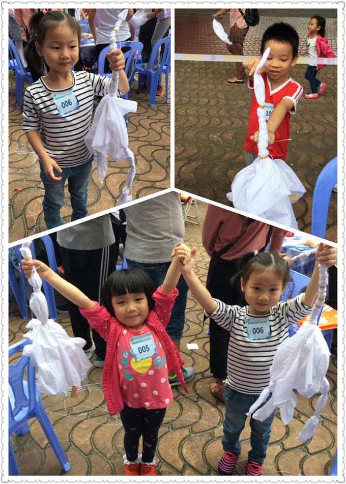 体验总是充满乐趣的,古老的染布过程很有趣。这种古老的纺织品染色工艺—扎染技术,是用线、绳等对织物进行紧固的结、系、捆、绑、缝扎,然后放在“染液中进行煮染”。小朋友听完染布操作的介绍,已经跃跃欲试,迫不及待地拿出一块白布,和妈妈们一起动手进行捆绑。有的帮忙捆绑橡皮筋;有的拿着线帮忙把布捆绑起来;有的拿着小剪刀帮妈妈把绳子剪断。