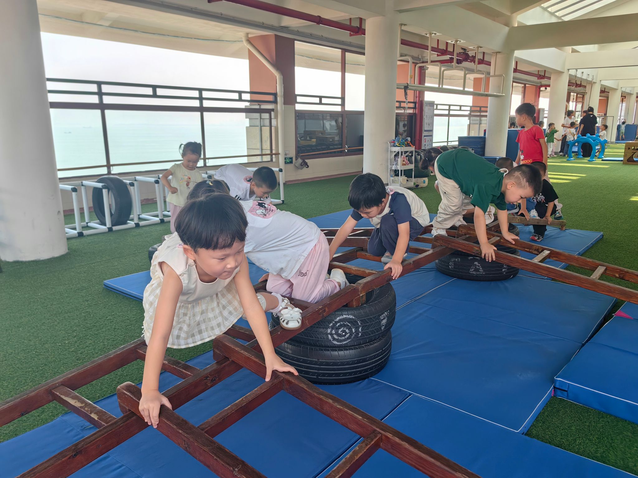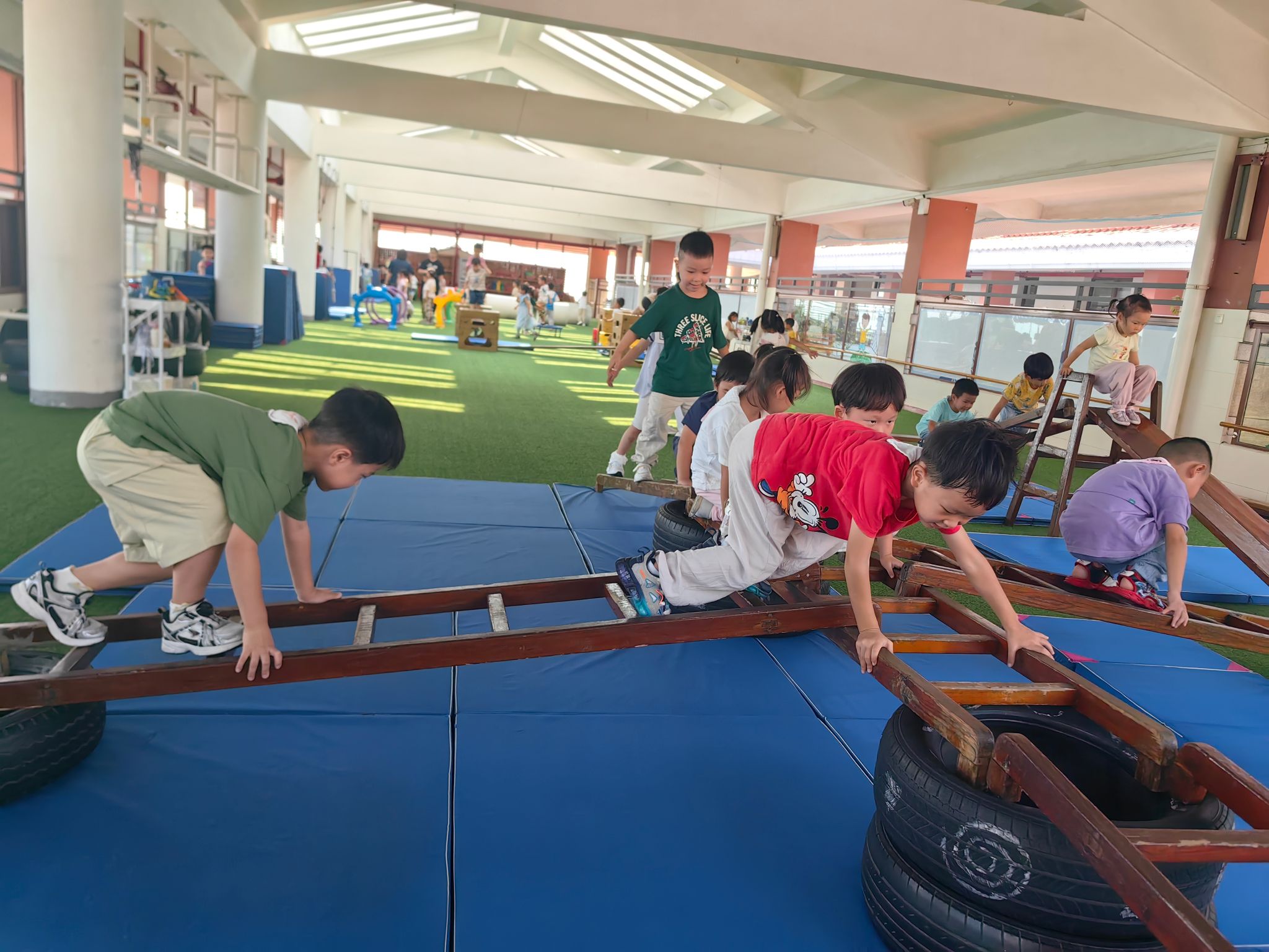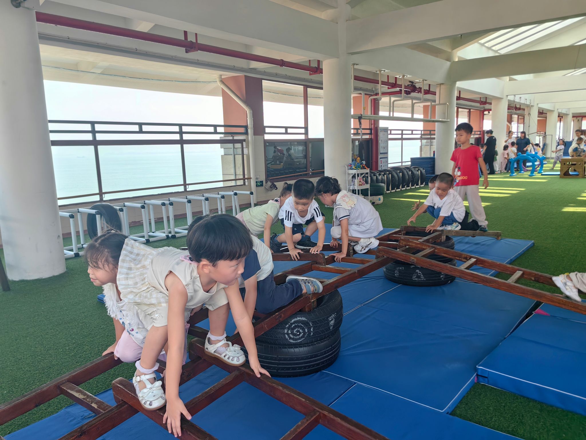 宝贝们手脚并用地爬上木梯,勇敢地跨越轮胎,不仅锻炼了手臂和腿部力量,还变得更加灵活协调。每一次成功的跨越,都能听到他们自豪的欢呼:“我是勇敢的小勇士!”