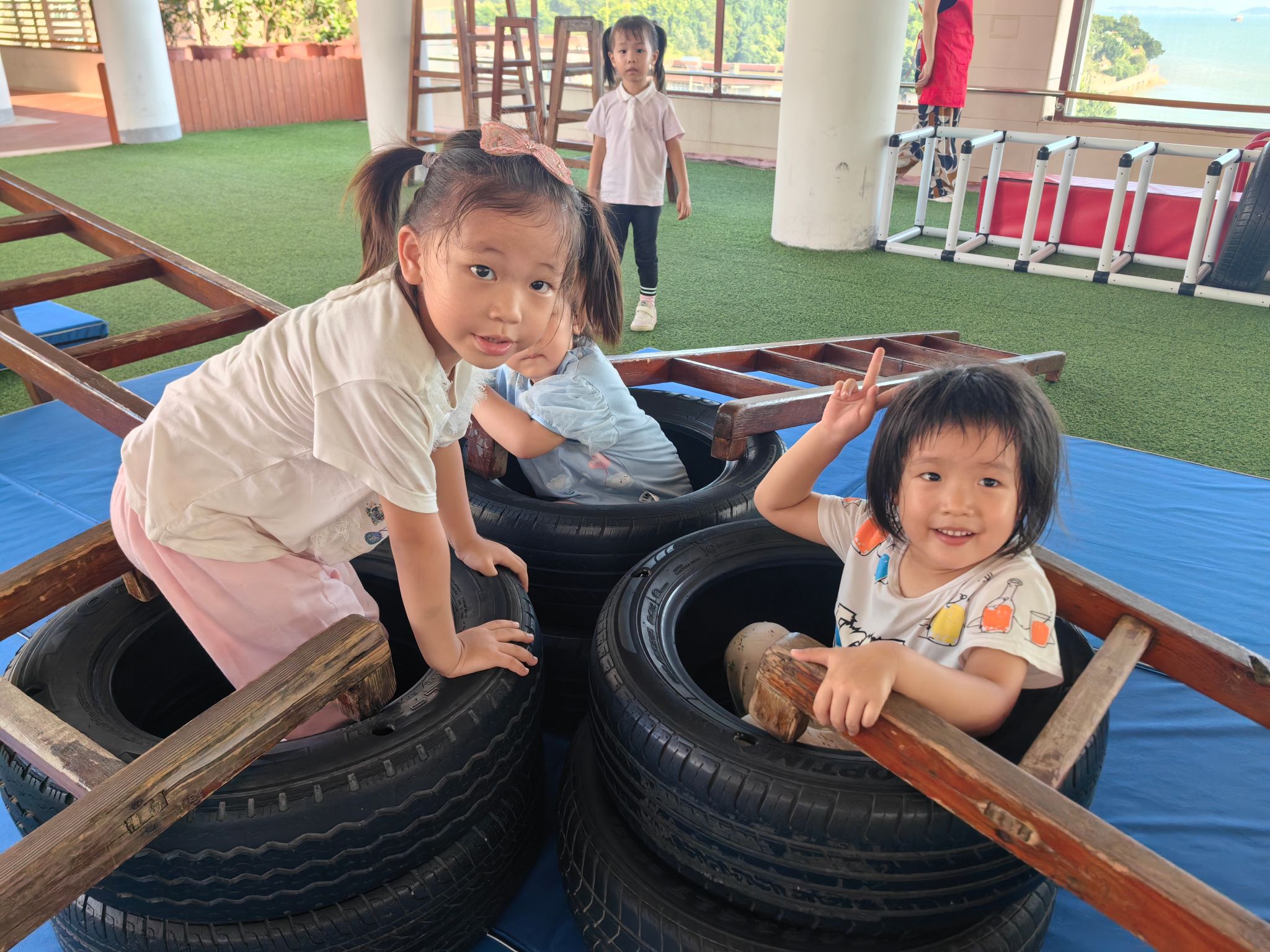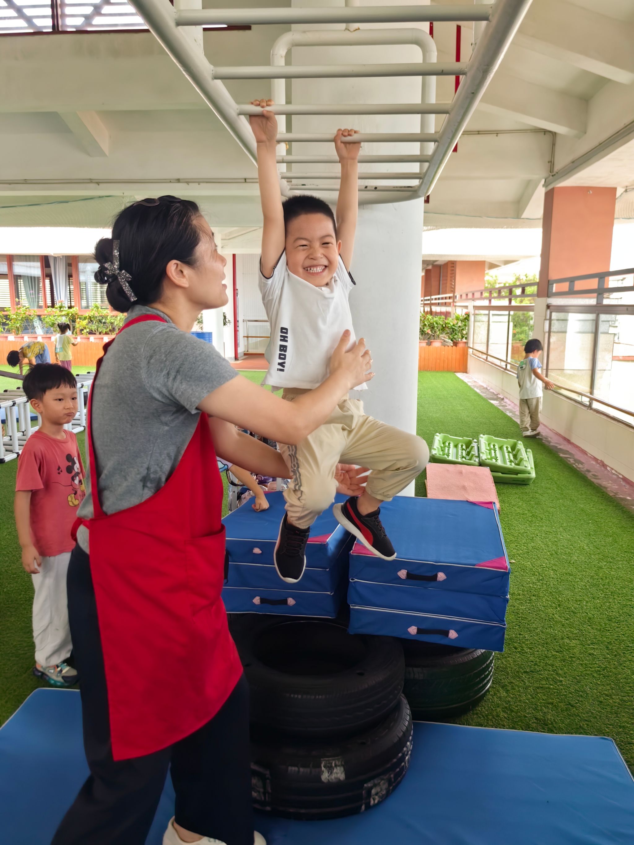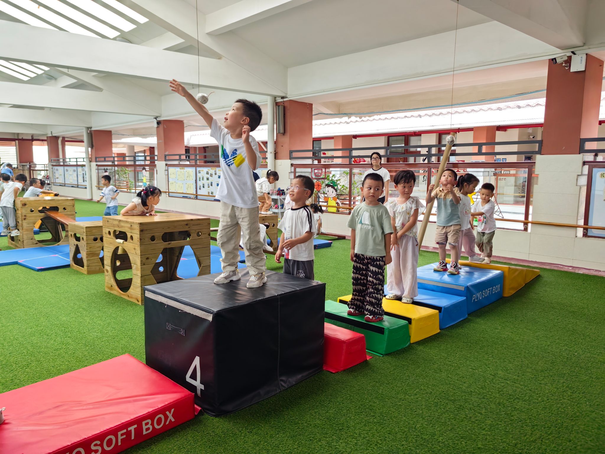 宝贝们手脚并用地爬上木梯,勇敢地跨越轮胎,不仅锻炼了手臂和腿部力量,还变得更加灵活协调。每一次成功的跨越,都能听到他们自豪的欢呼:“我是勇敢的小勇士!”