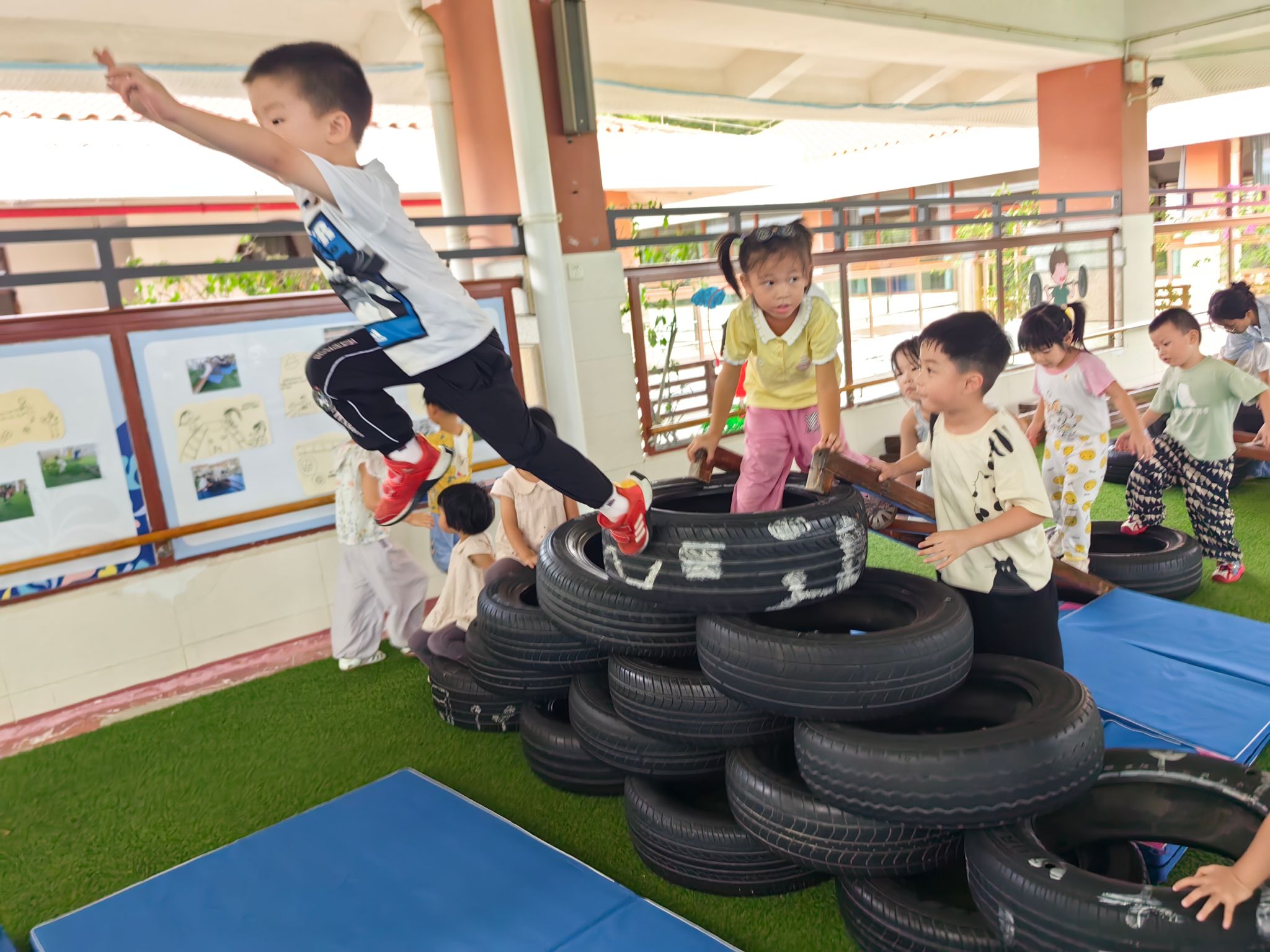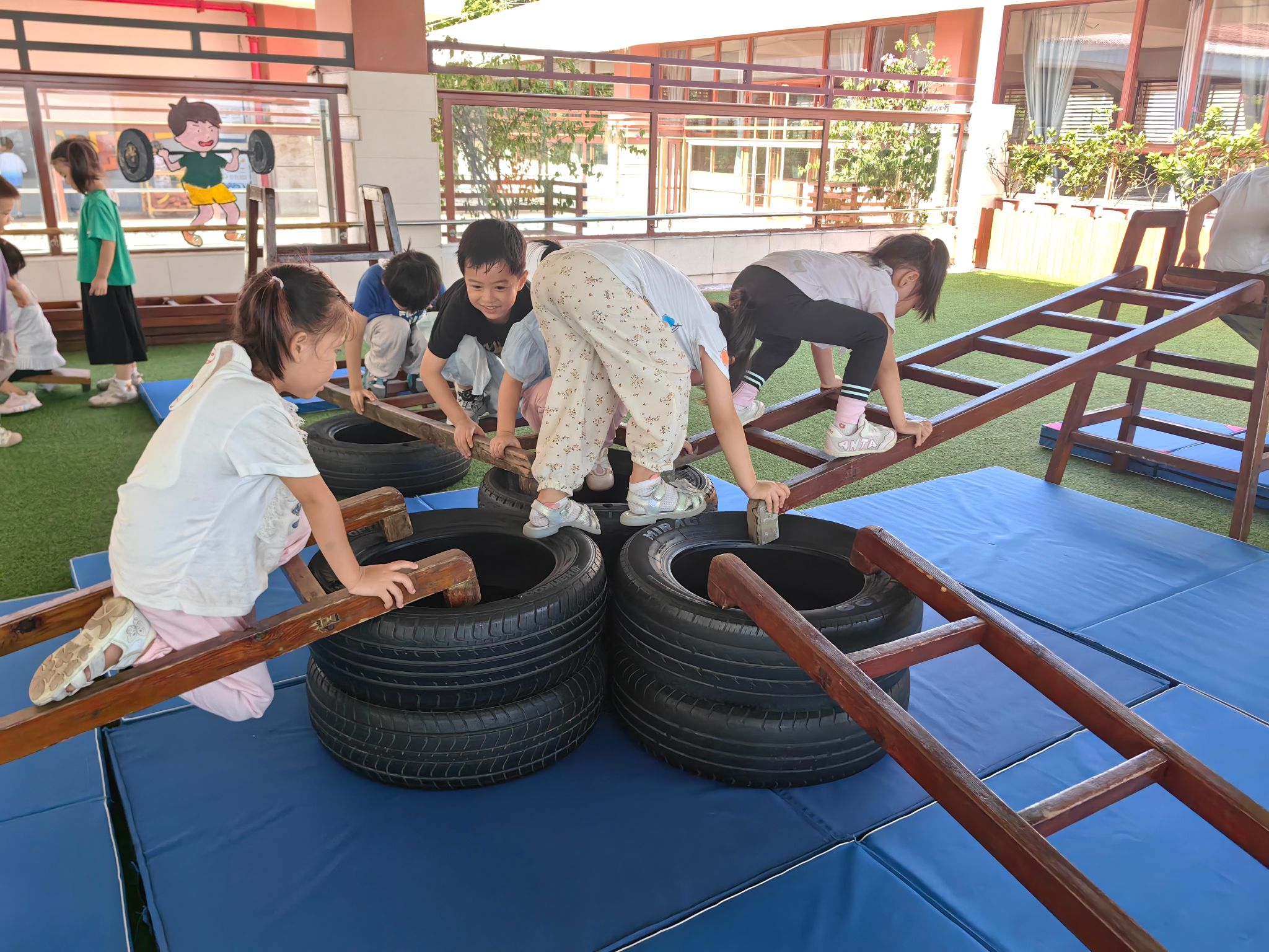 轮胎、木梯和木板在孩子们手中,变成了一座又一座充满挑战的“小山”“战壕”。他们有的合作搬运木板,有的小心翼翼地摆放轮胎,分工合作,不亦乐乎。