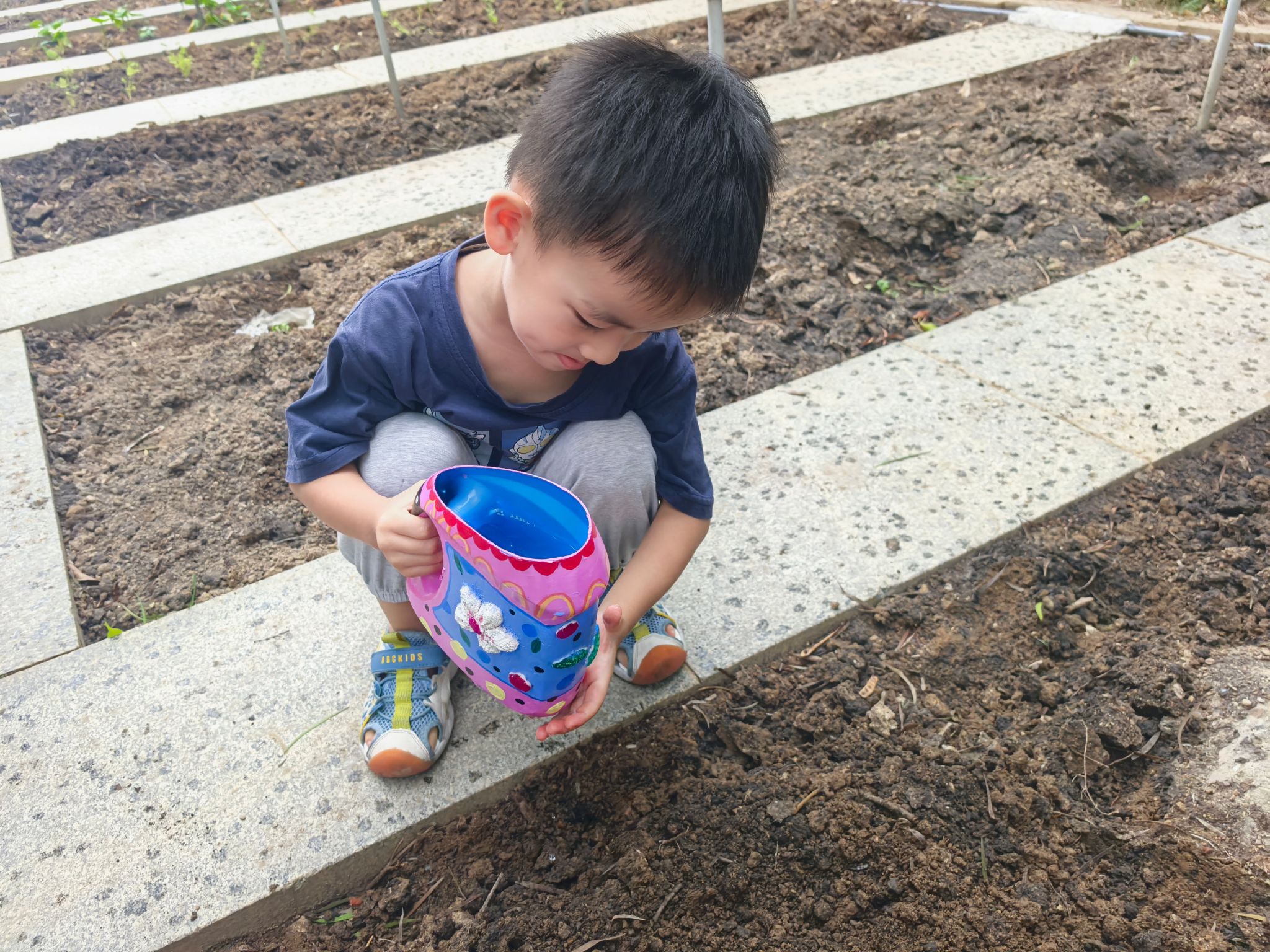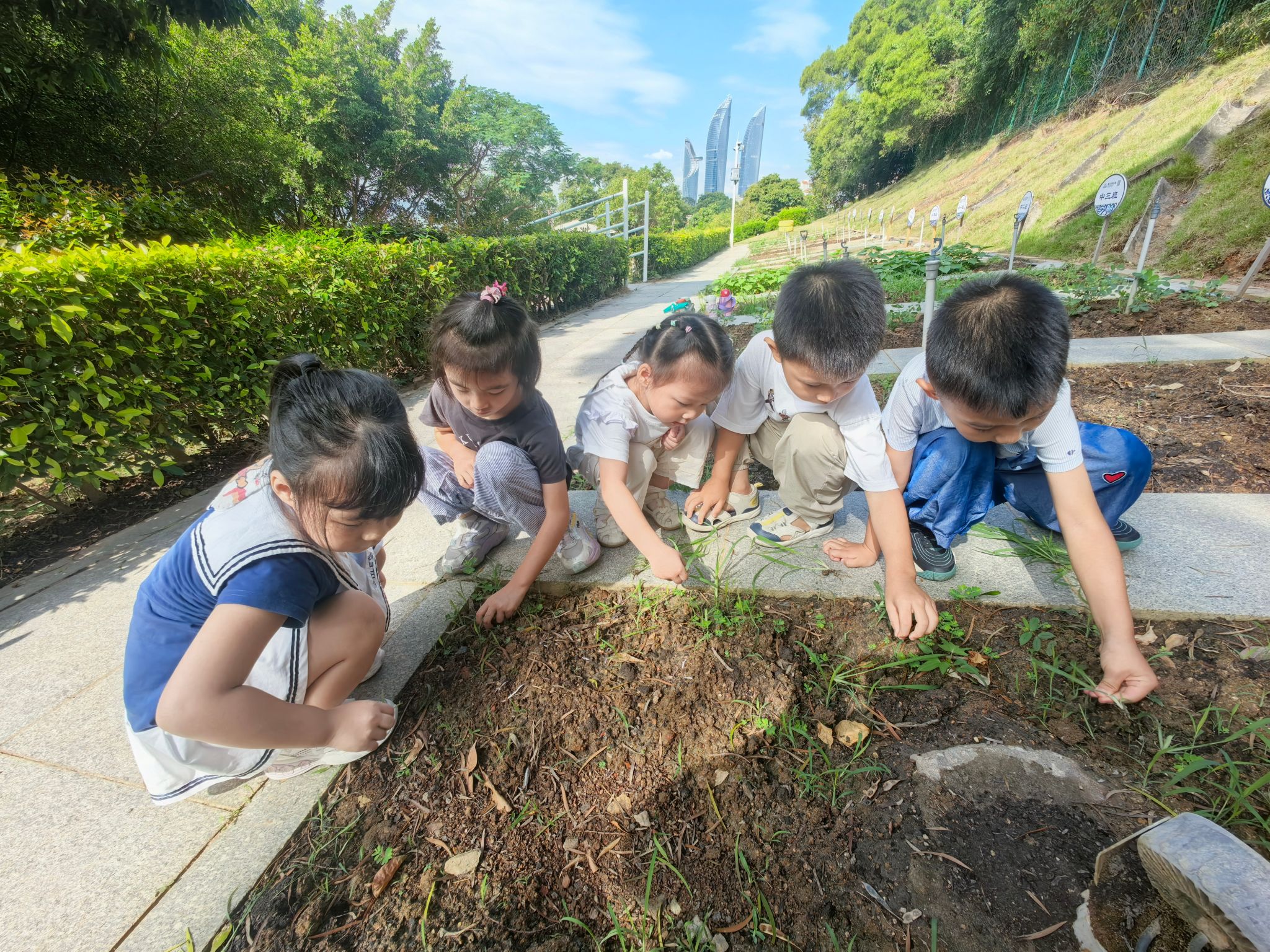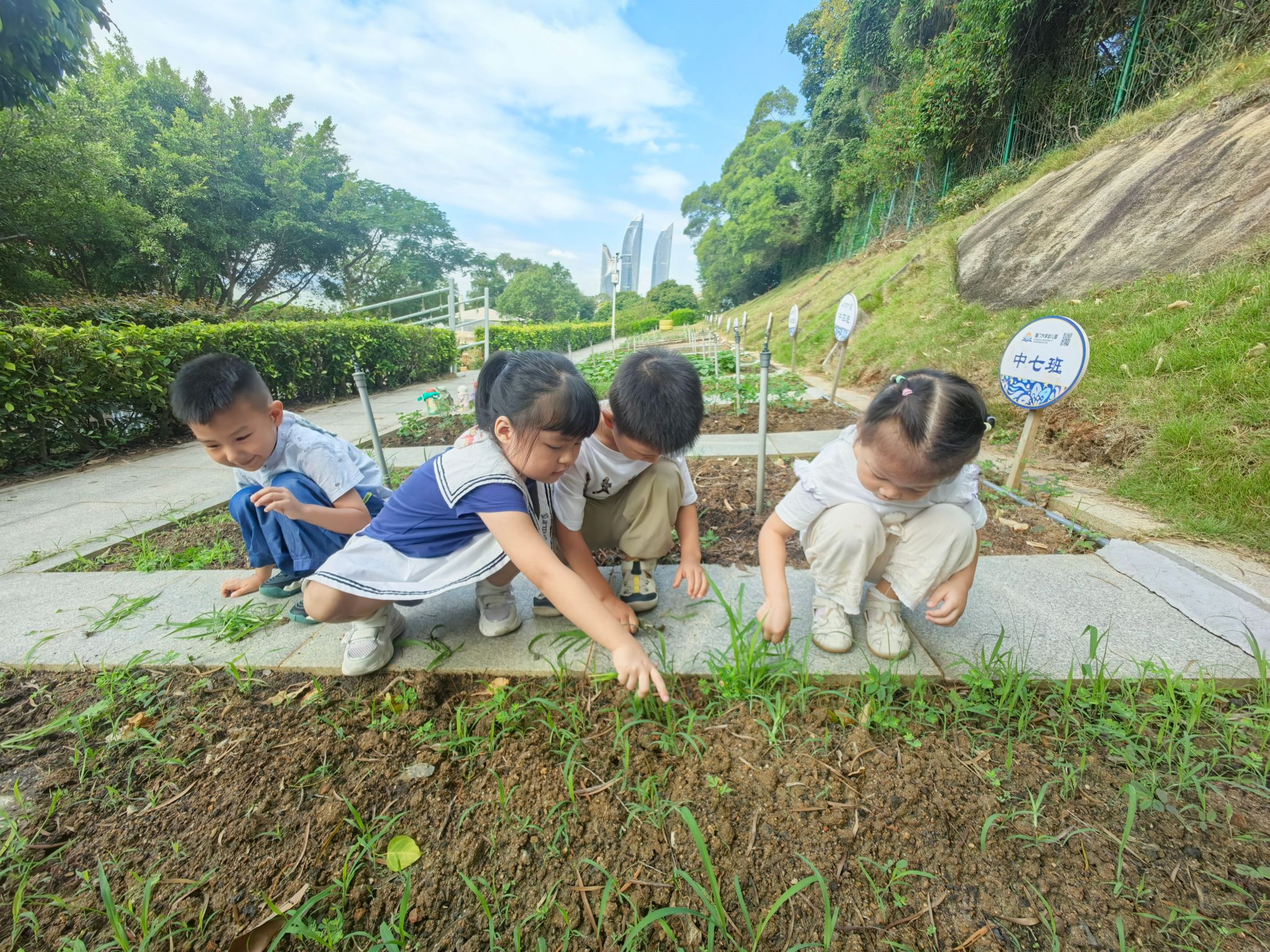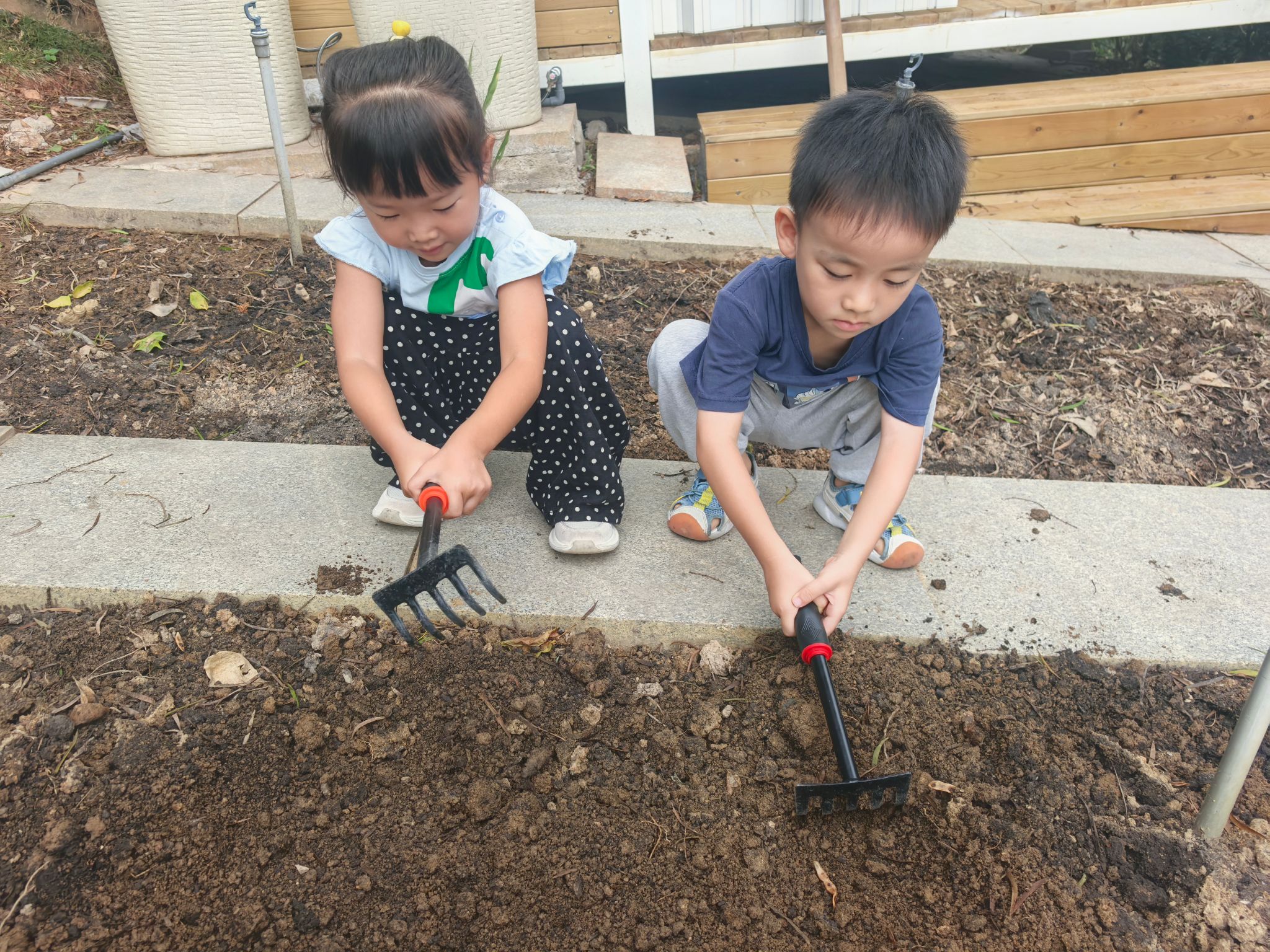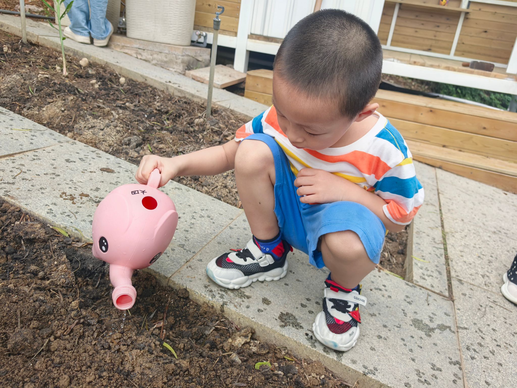 山坡菜地里满是热闹的身影。小朋友们蹲在菜地边,小心翼翼地把种子放进土里,小手捧着水壶轻轻浇水,嘴里还念叨着:“小种子快长大,我们陪你一起长高呀!”泥土的清香裹着笑声,连小蚂蚁都来凑热闹。