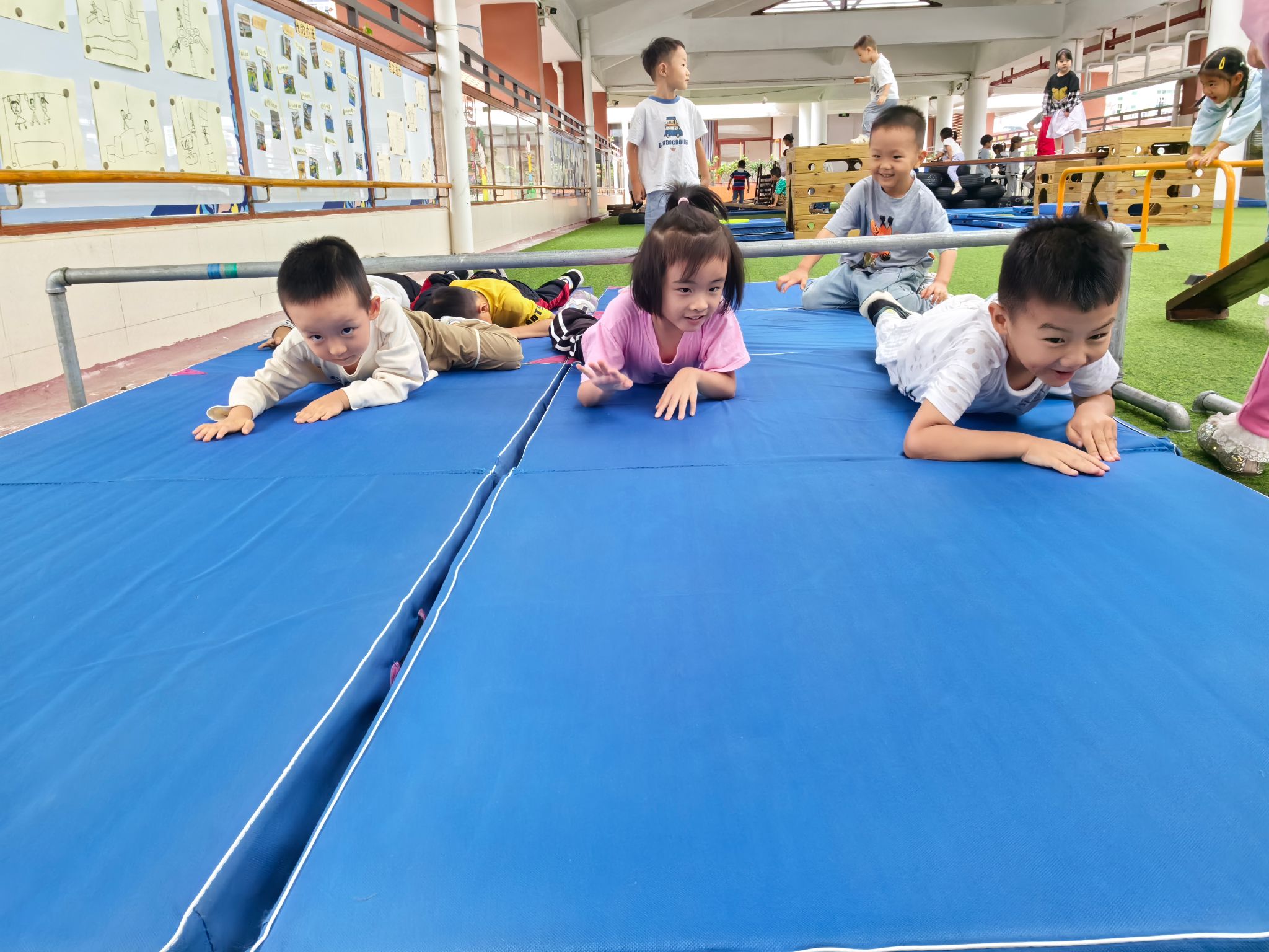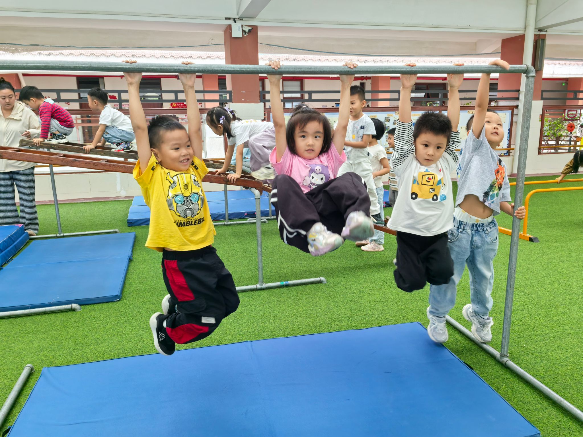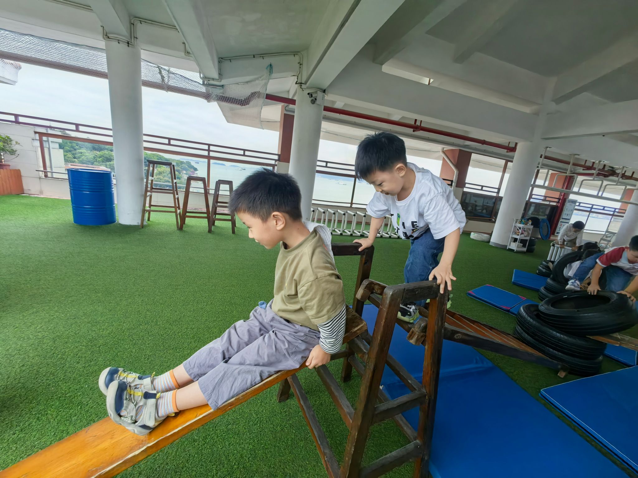 天台的运动区藏着大大的挑战。轮胎架起的“小桥”上,小朋友小脚丫踮得轻轻的;横杆下,小手扒得紧紧,小屁股撅得高高往前爬;软垫上,小朋友们扑棱着胳膊“匍匐冲锋”。连汗珠都裹着甜丝丝的劲儿!每一次攀爬,都是成长的小勋章。