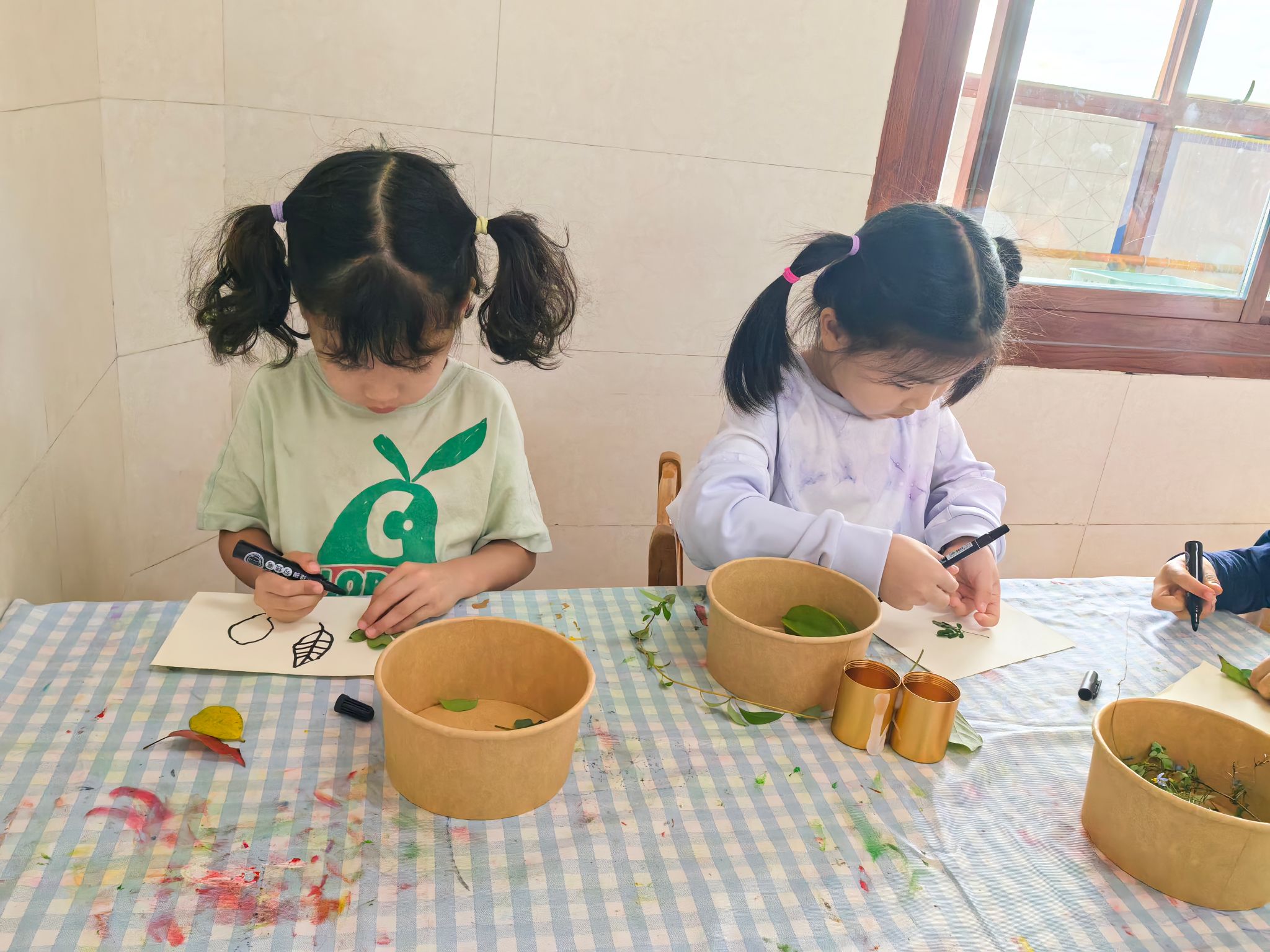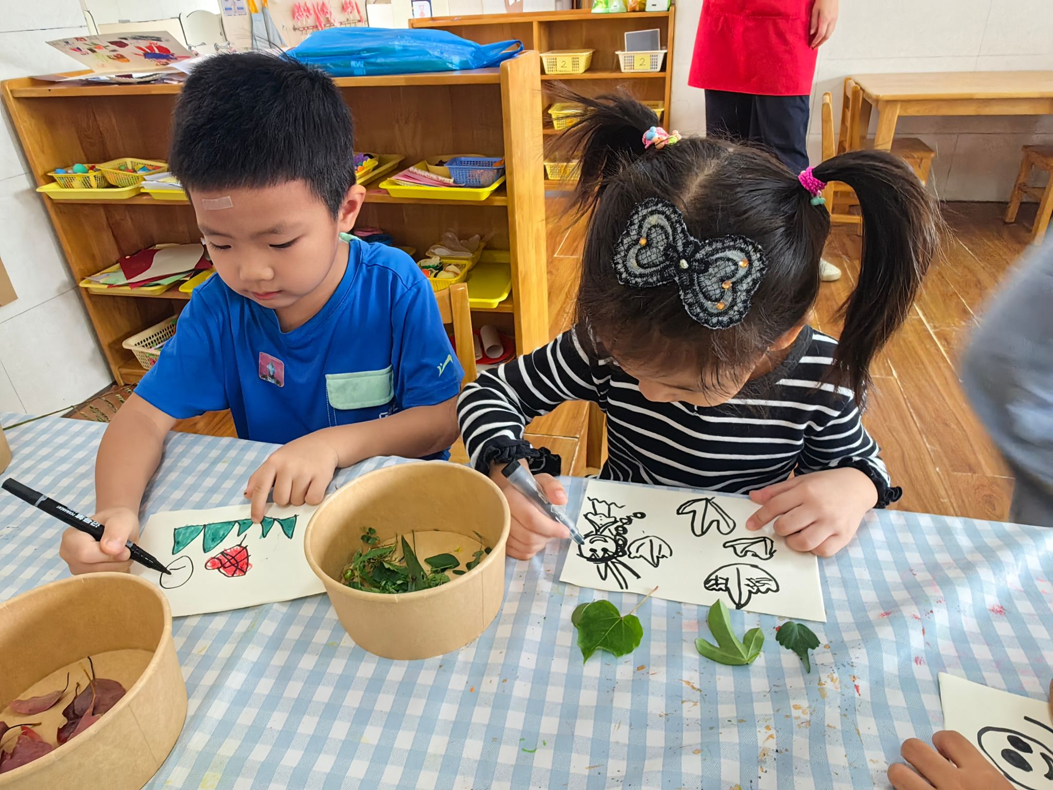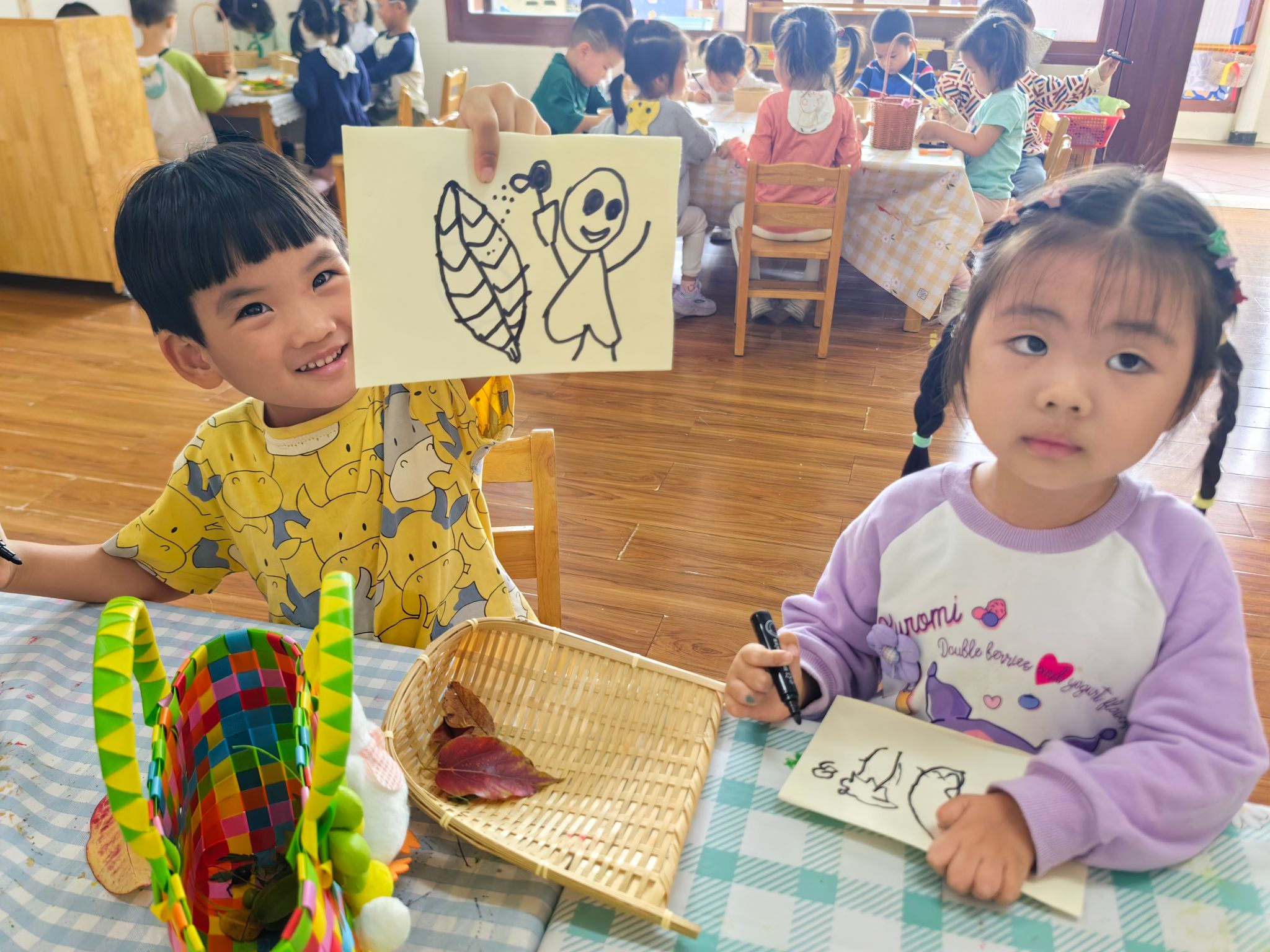 从山坡带回的彩叶、红花、杨桃叶,还成了萌娃们的“模特”。他们化身“小画家”,用画笔把对叶子的惊喜定格在纸上。