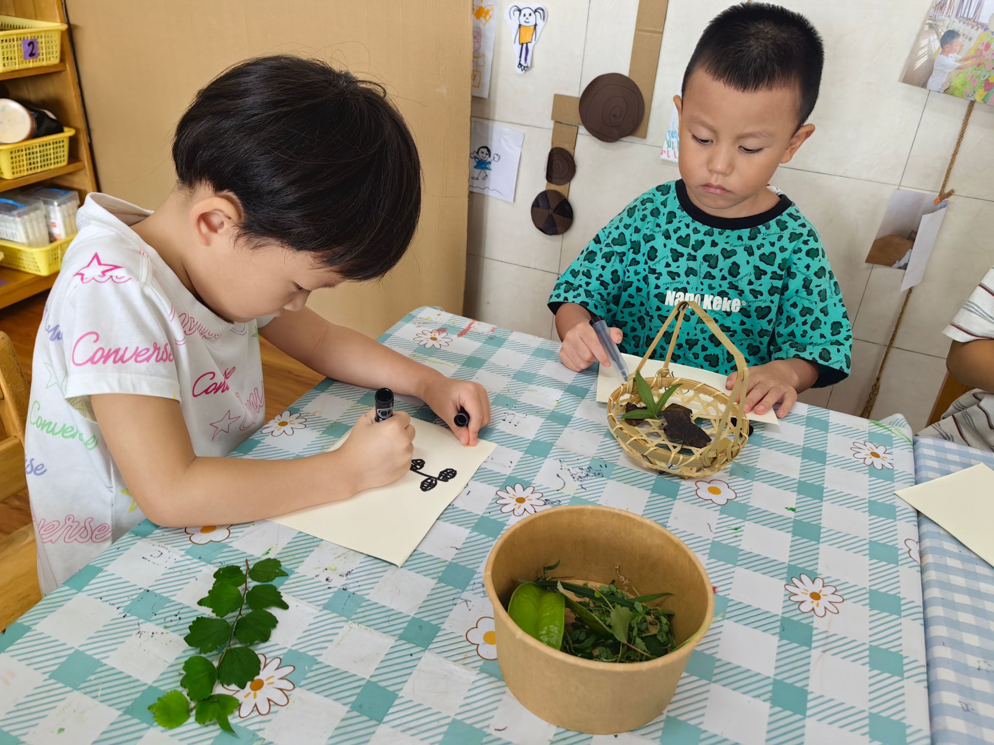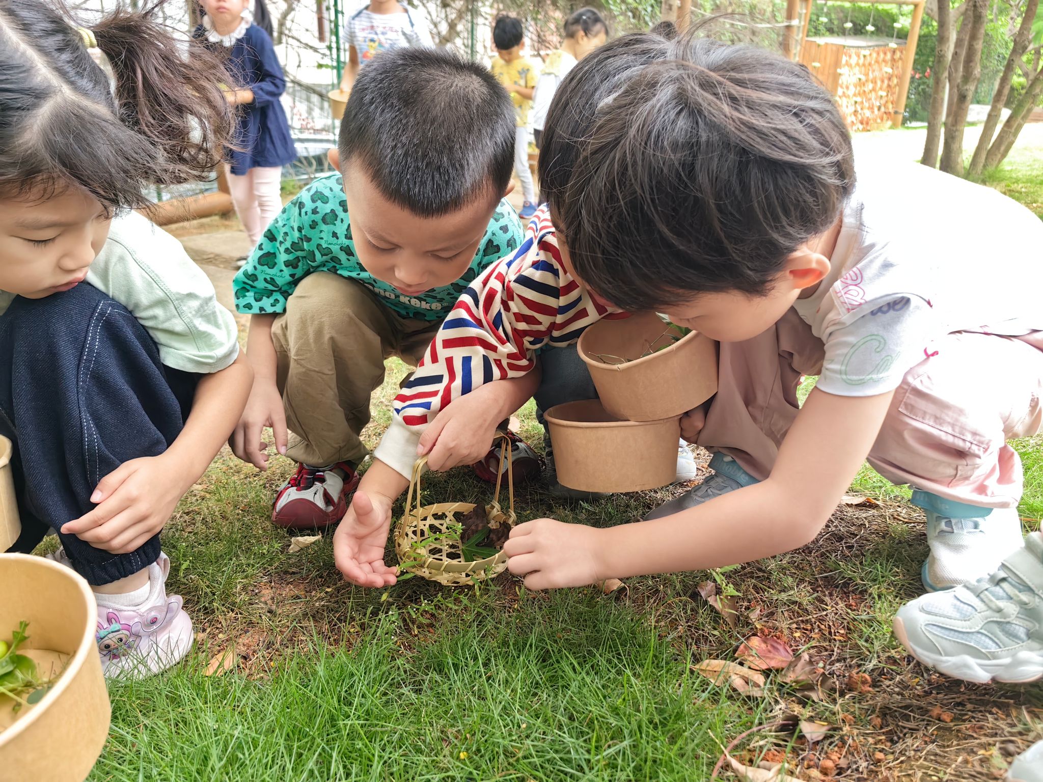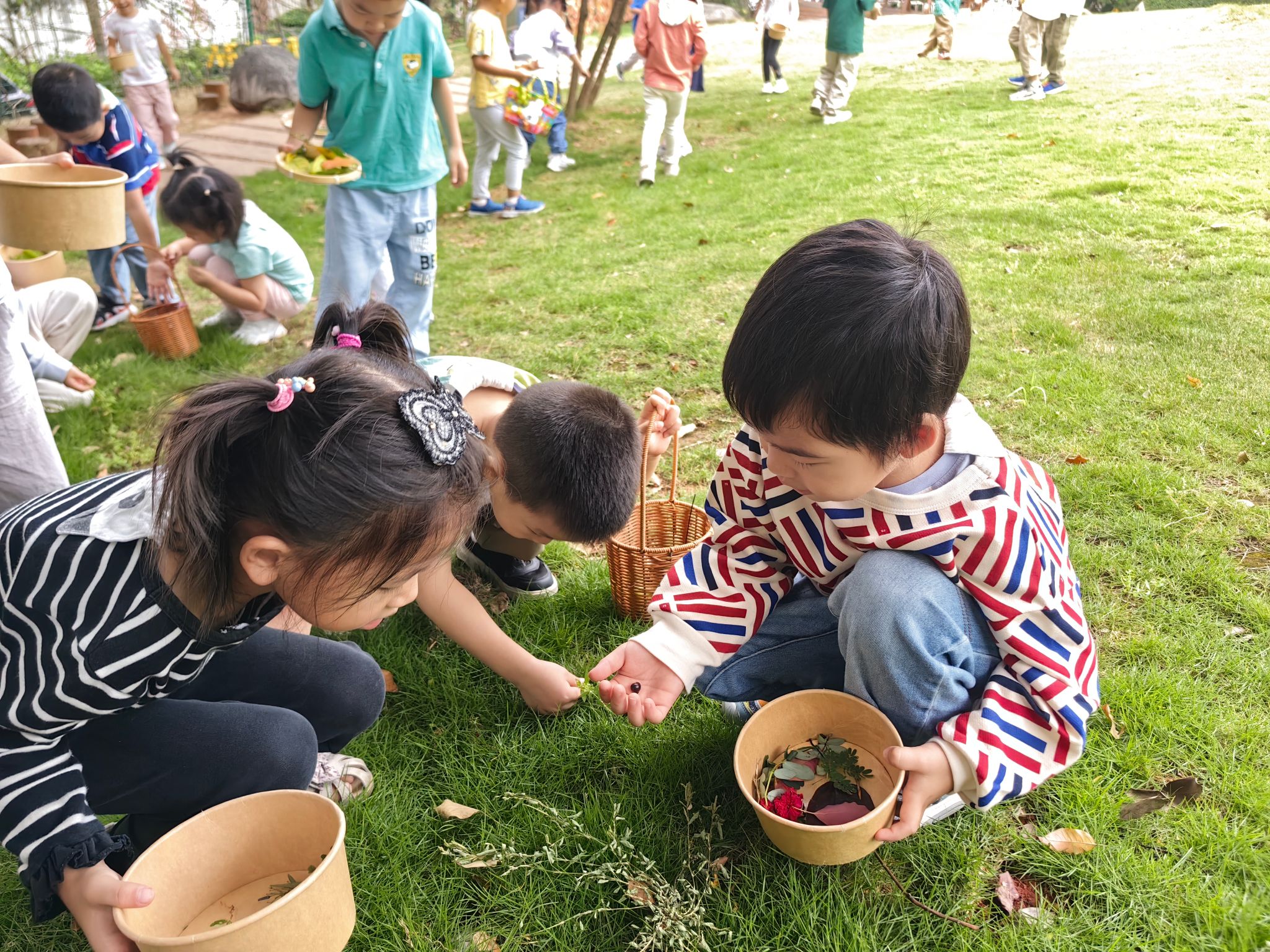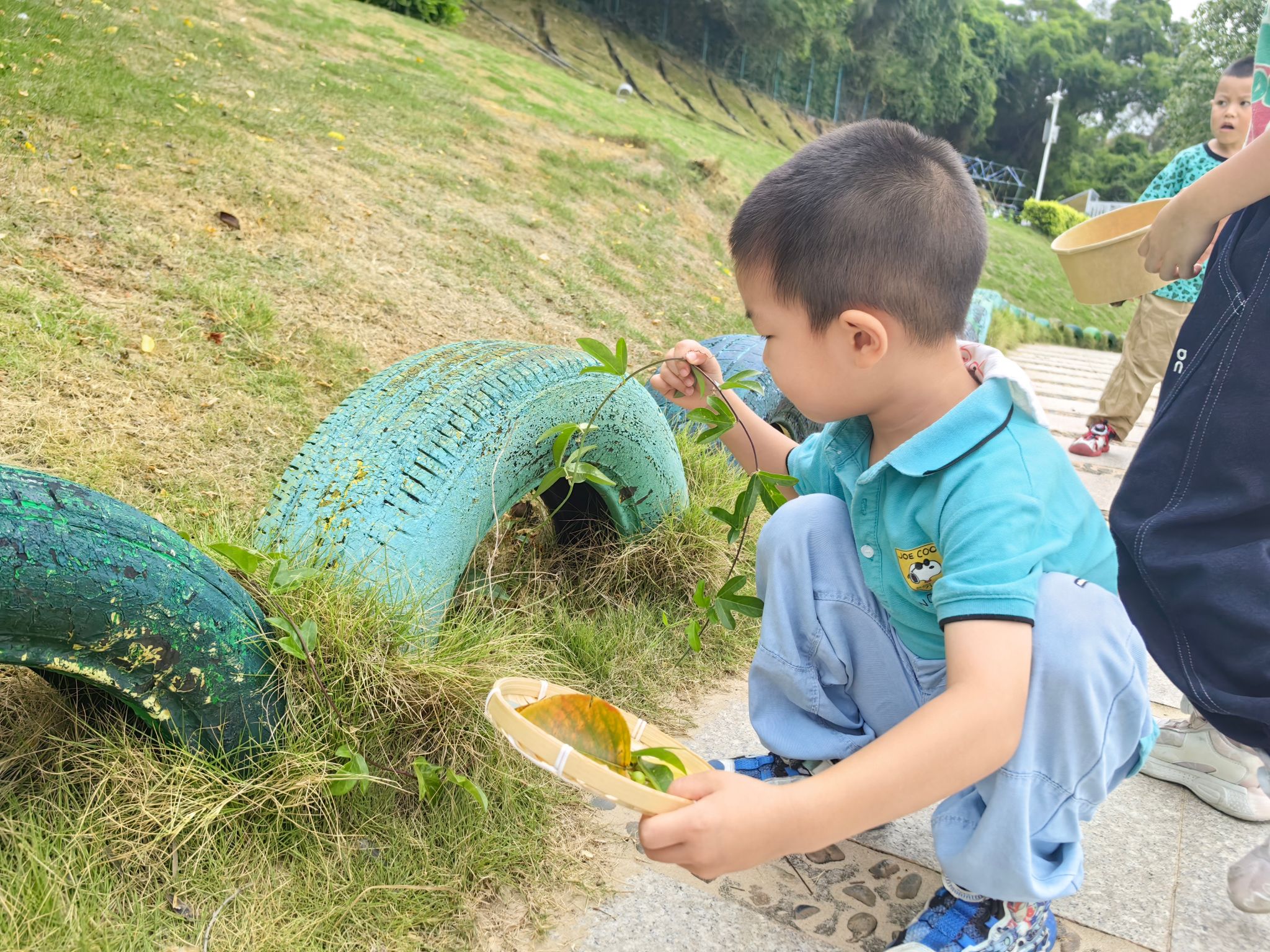 他们小心翼翼地将这些“宝藏植物”放进竹篮、蛋托,不一会儿,容器里就装满了形状、颜色各异的花叶,每一片都藏着他们对自然的好奇。