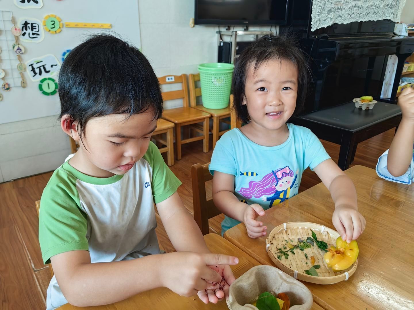从幼儿园小山坡的初次邂逅,到厦园与公园的再次寻踪,中二班的萌娃们认识了形态各异的草木,初探了藏在花叶里的小秘密,已在心中种下了热爱自然的“种子”。而这份与草木的美好联结,也将在今后的草木染活动中延续……