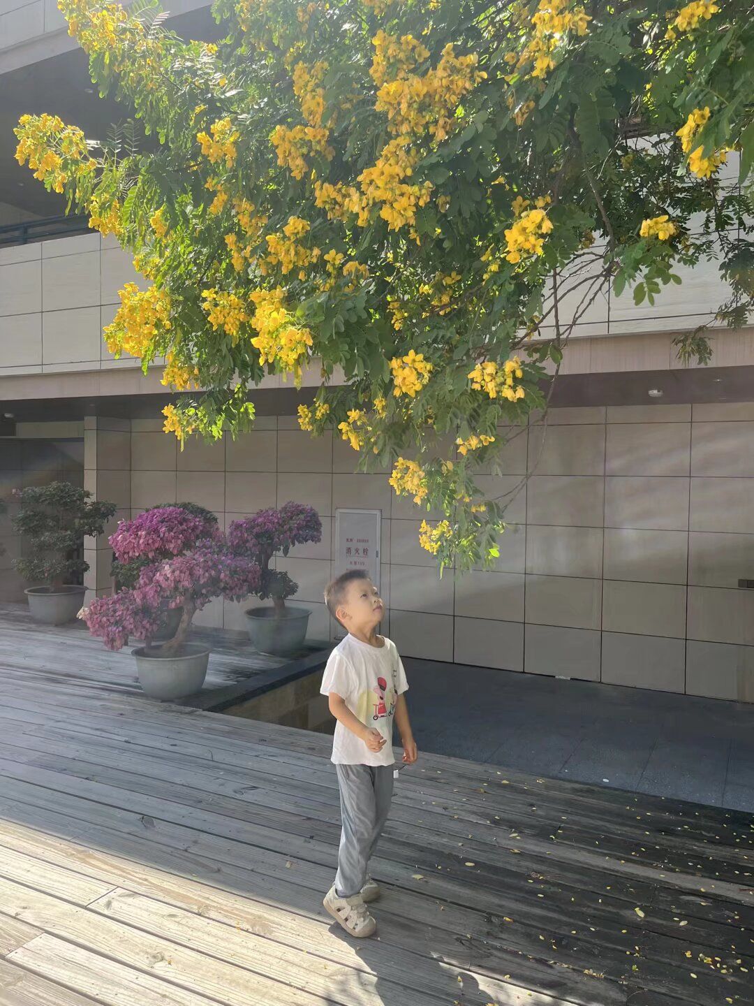 “快看,这棵树的黄花像星星一样,把我都看入迷啦!”