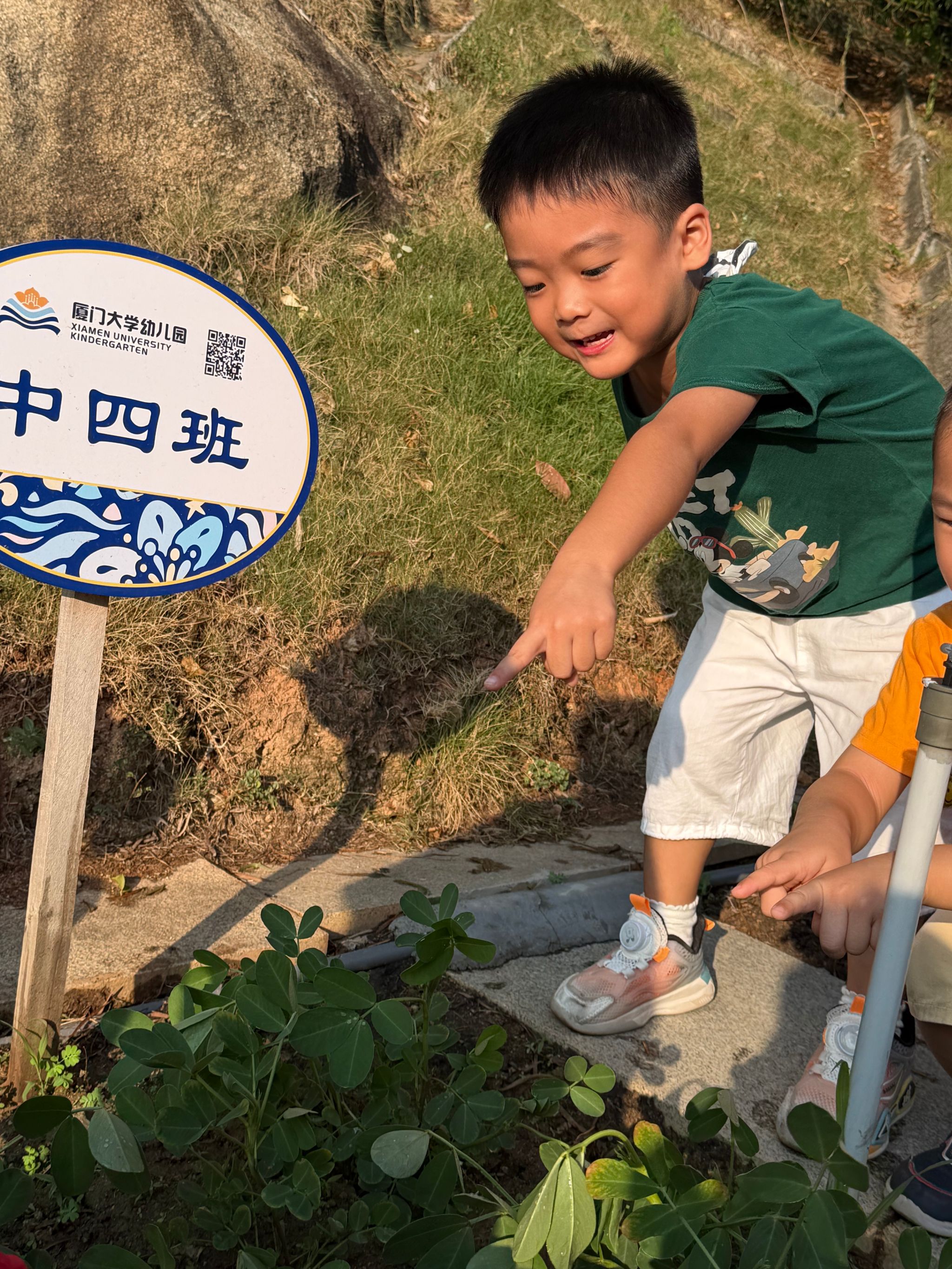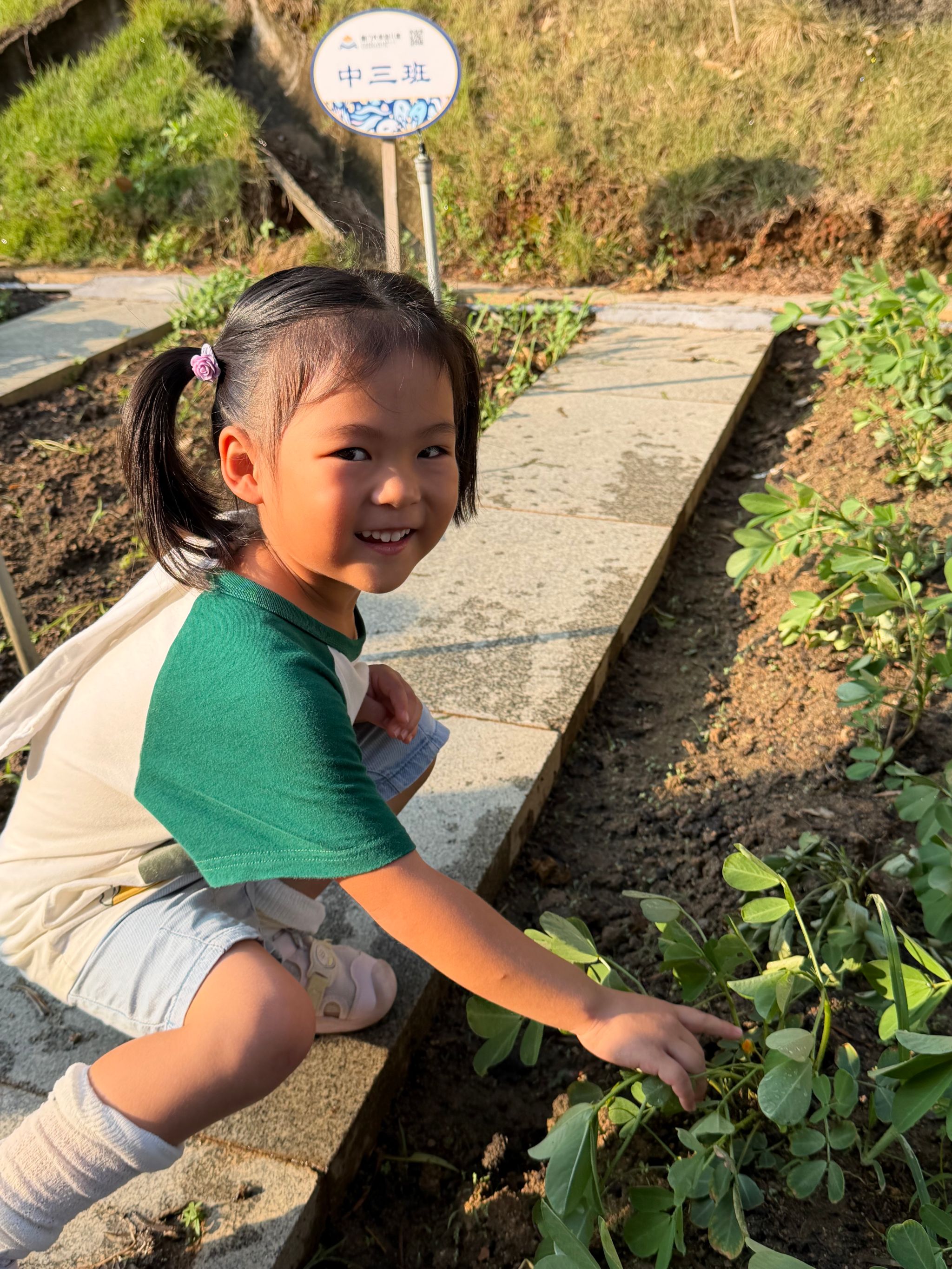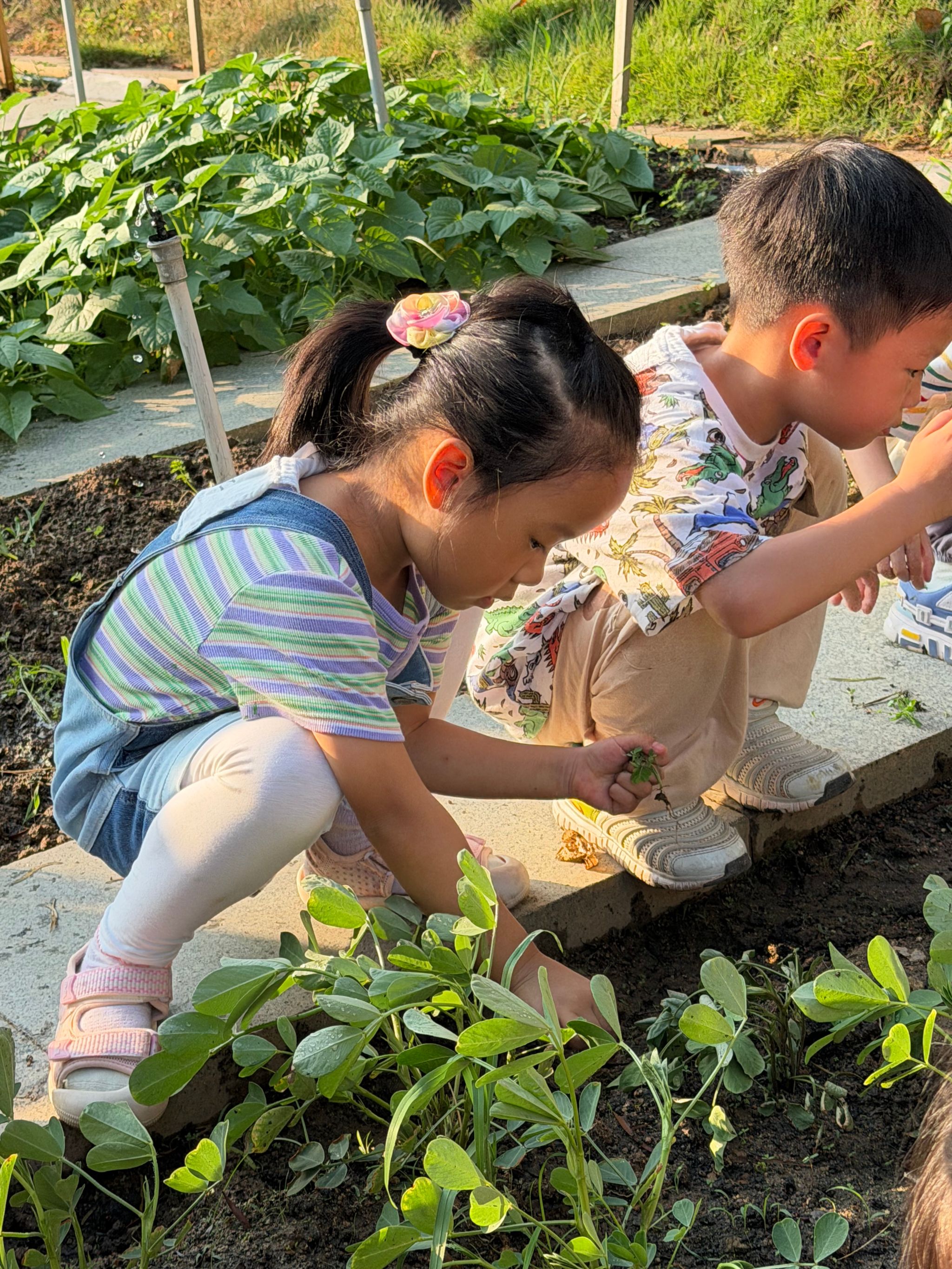菜地里有孩子们忙碌的身影,他们拎着小水壶、拿着小铲子,有的小心翼翼拔去菜苗旁的杂草,有的慢慢给蔬菜浇水,还有的蹲在花生苗前,小声和新冒头的嫩叶打招呼观察它新长出的嫩叶;