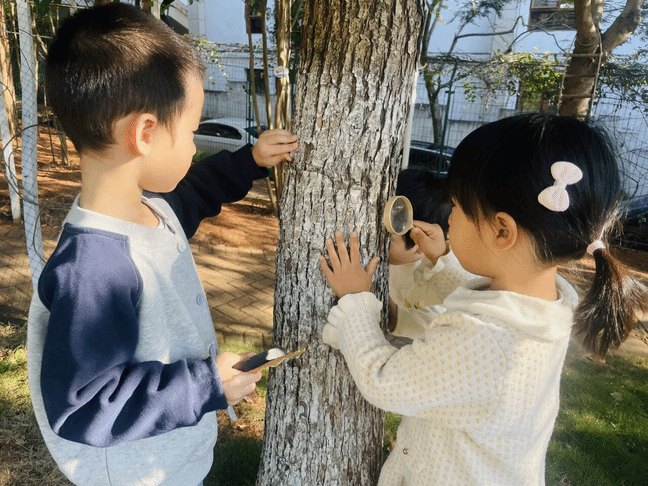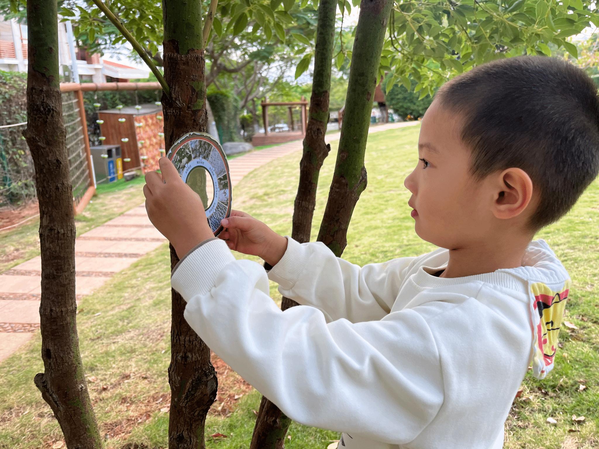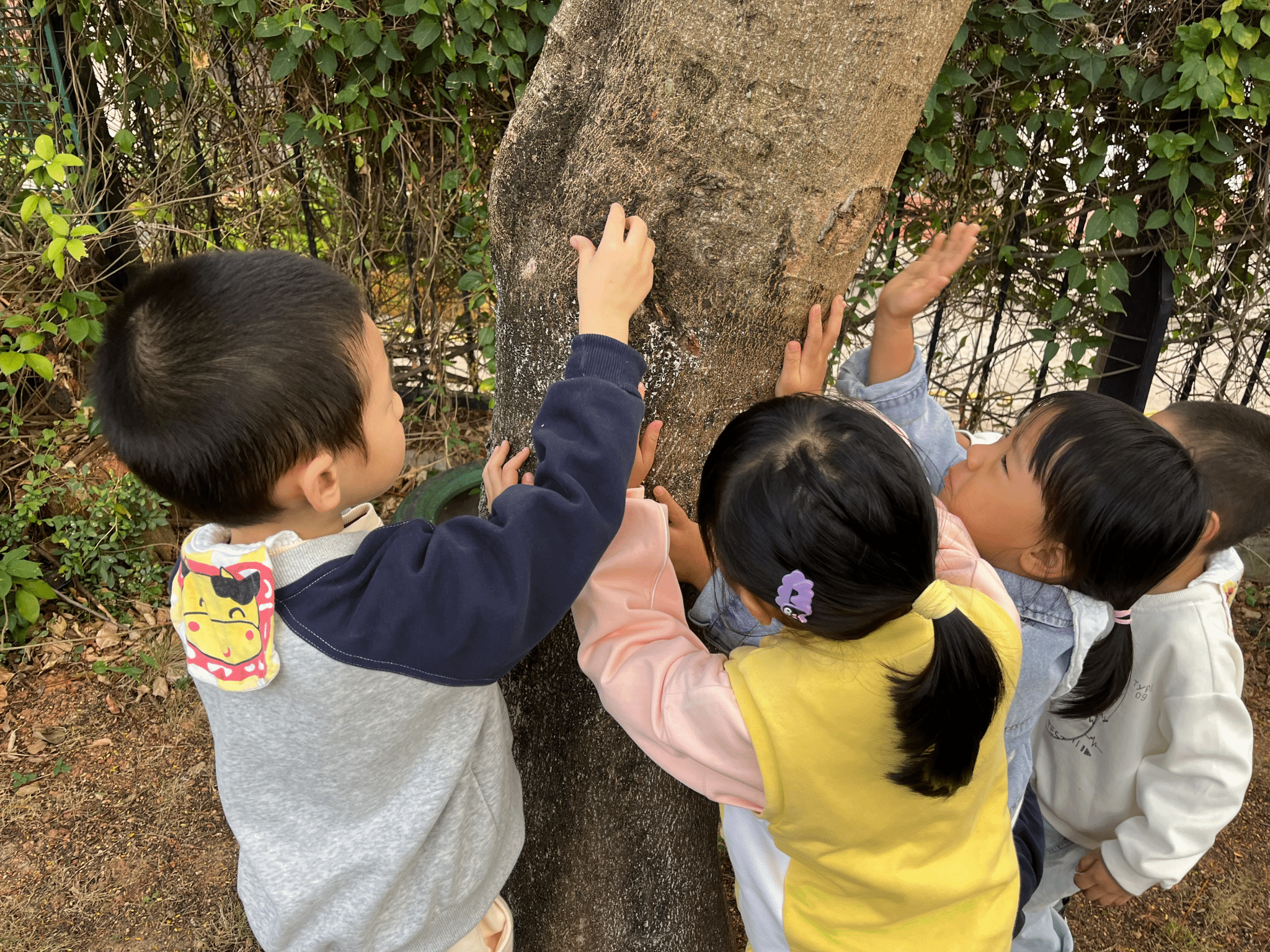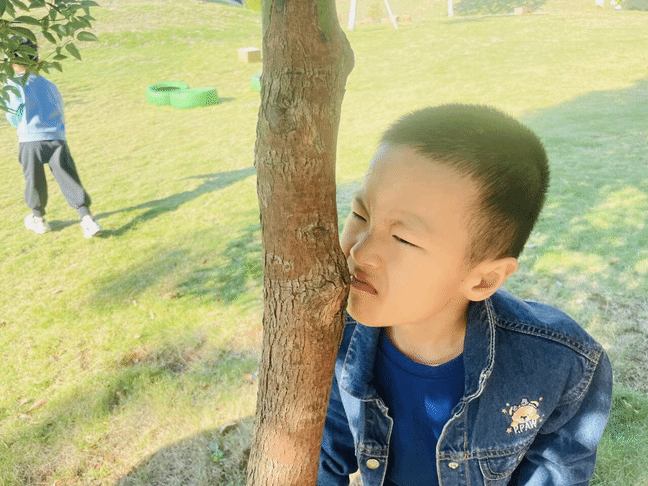 大树的 “皮肤” 藏着好多小秘密呢!宝贝们拿出树皮肌理观察卡,蹲在树底下仔细比对:“这棵树的皮摸起来毛毛的,像小刺猬的背!”“这棵的皮滑溜溜的,还带着浅浅的纹路~” 有的宝贝忍不住把小鼻子凑上去闻一闻,“有淡淡的清香呀!”,有的用小手指轻轻划过树皮,感受着不一样的触感,脸上满是惊喜的小表情,原来每棵树的 “衣服” 都不一样呢!