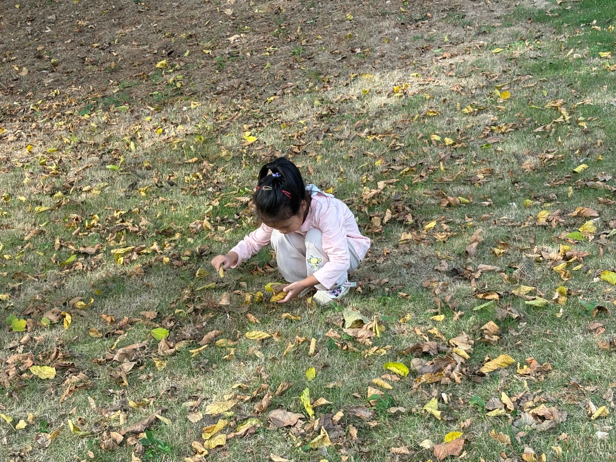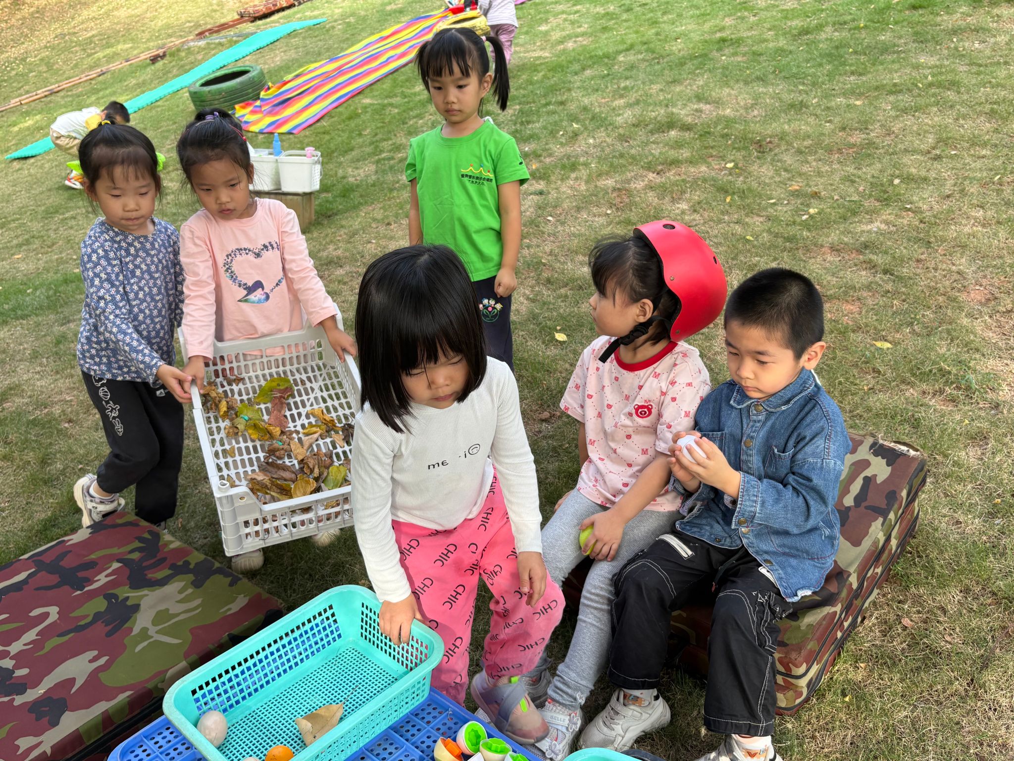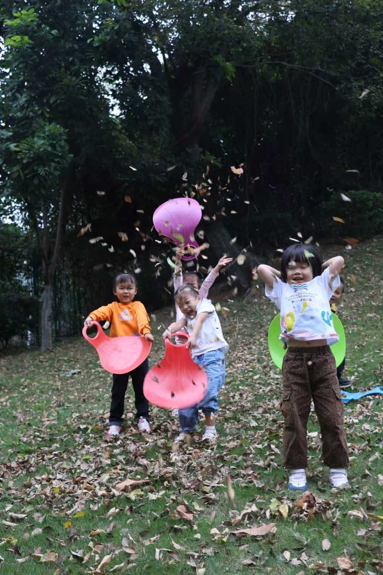 滑累了,大家又跑到树下玩起了过家家。他们蹲在厚厚的落叶堆里,细心挑选着心形的叶子当“盘子”,扇形的树叶叶作“小碗”,再把松果当作“美味佳肴”,摆满了一地。几个孩子用树枝搭起“小灶台”,假装煮起了树叶汤,还像模像样地招呼伙伴:“快来尝尝秋天的味道呀!”