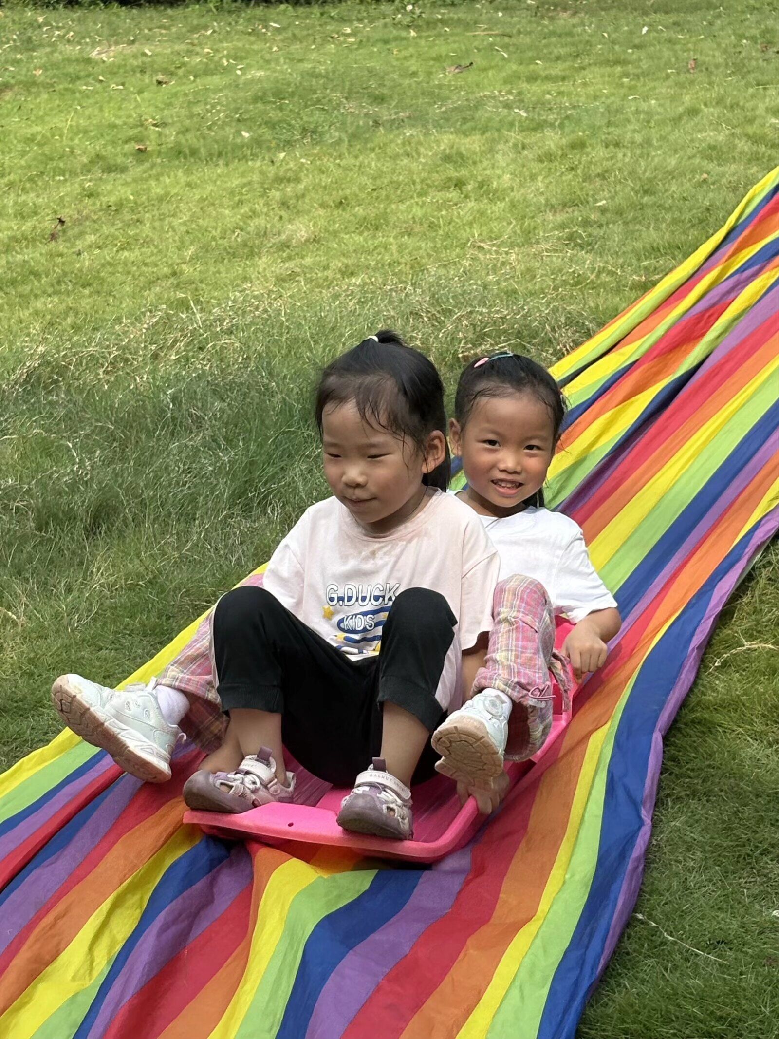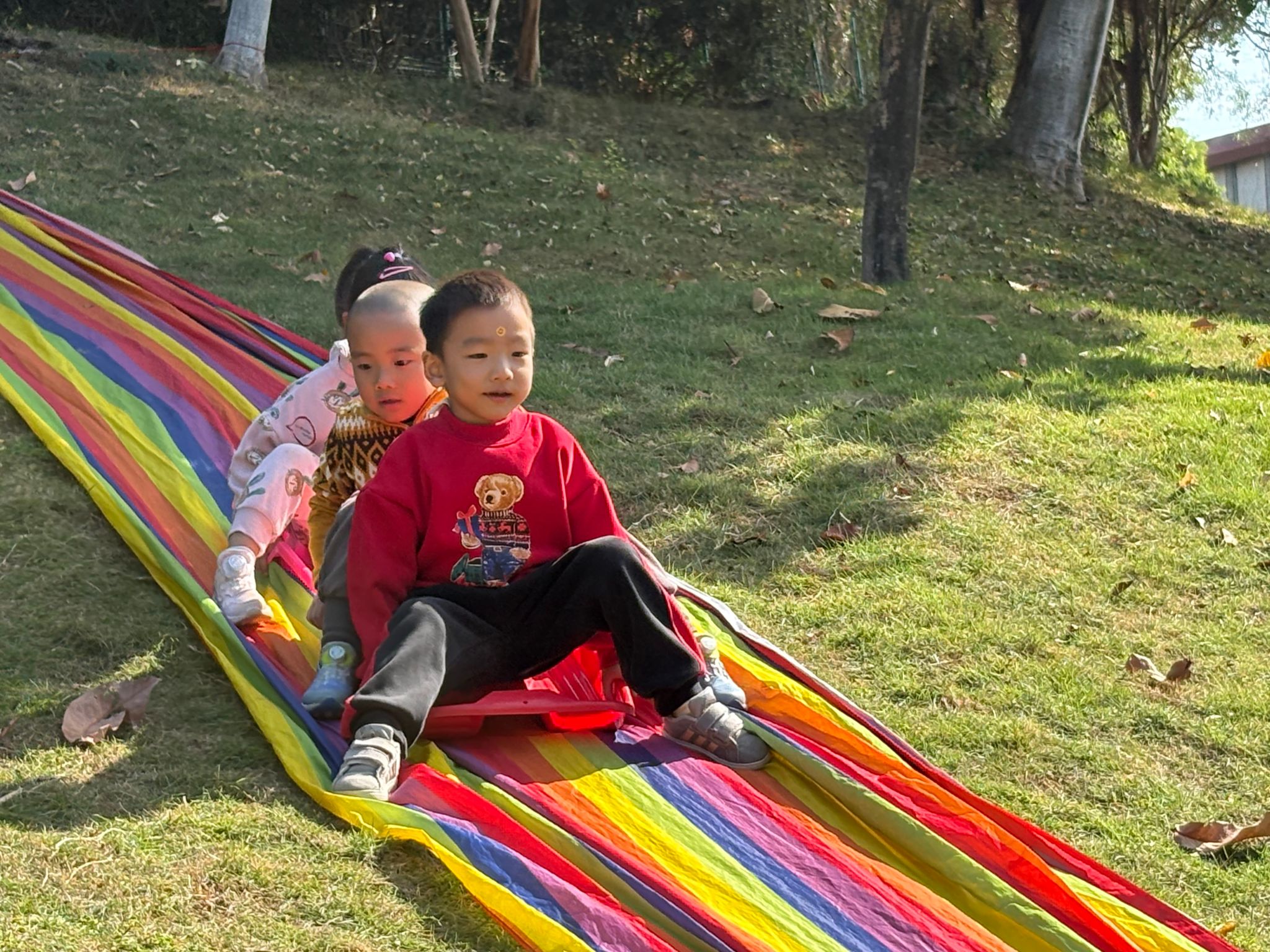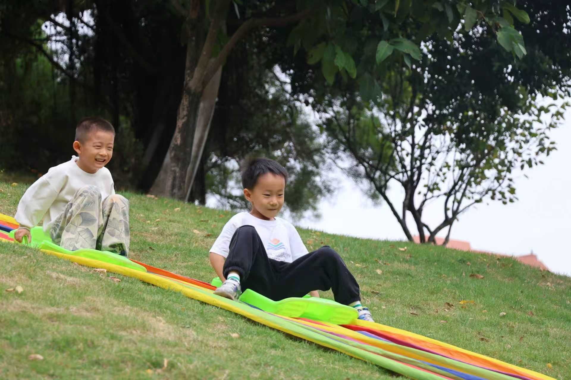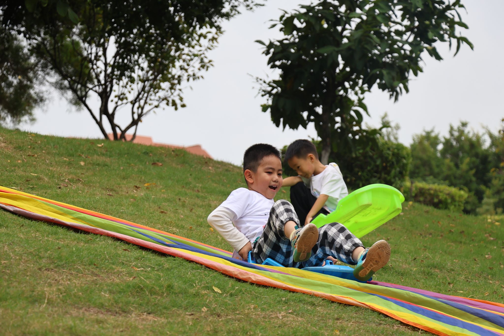 深秋的阳光下,中七班的小朋友们像一群欢快的小麻雀,奔向金灿灿的滑草场。最吸引人的是那条彩虹滑道,孩子们轮流坐上滑草板,双手紧握扶手,尖叫着从坡顶飞驰而下,小脸红扑扑的满是兴奋。