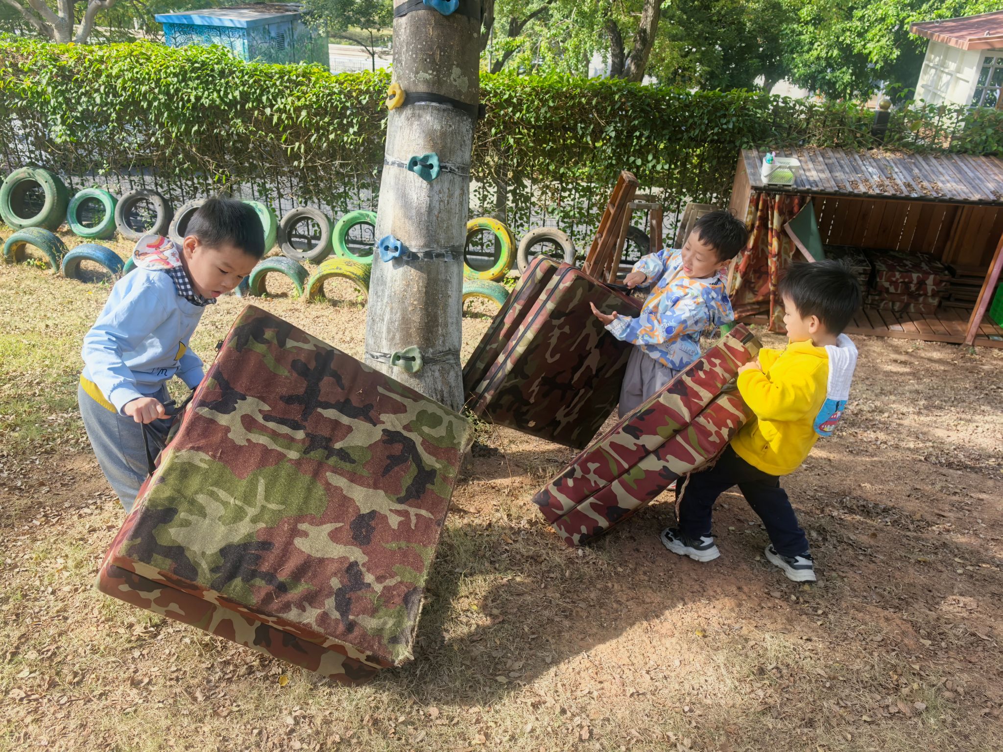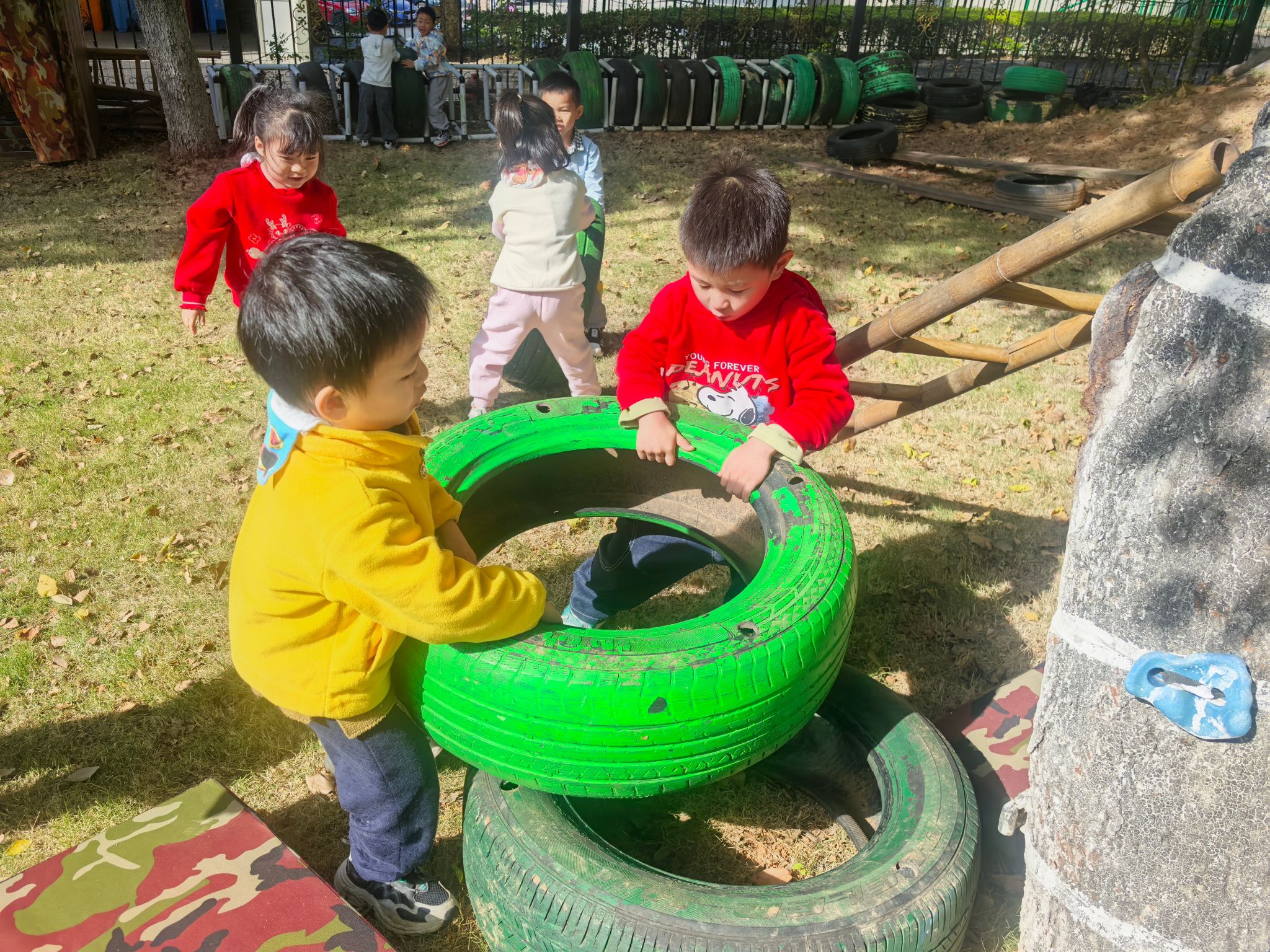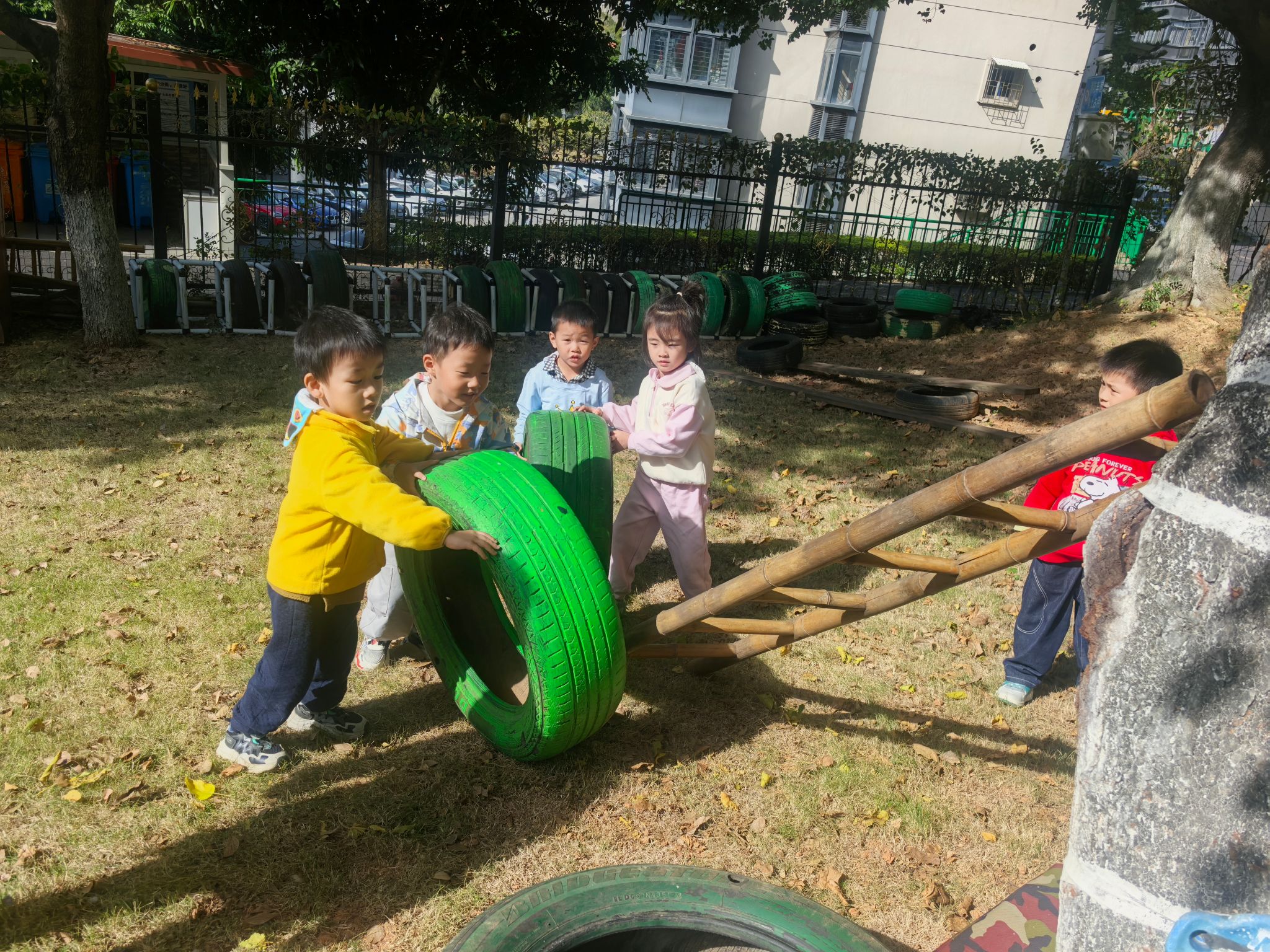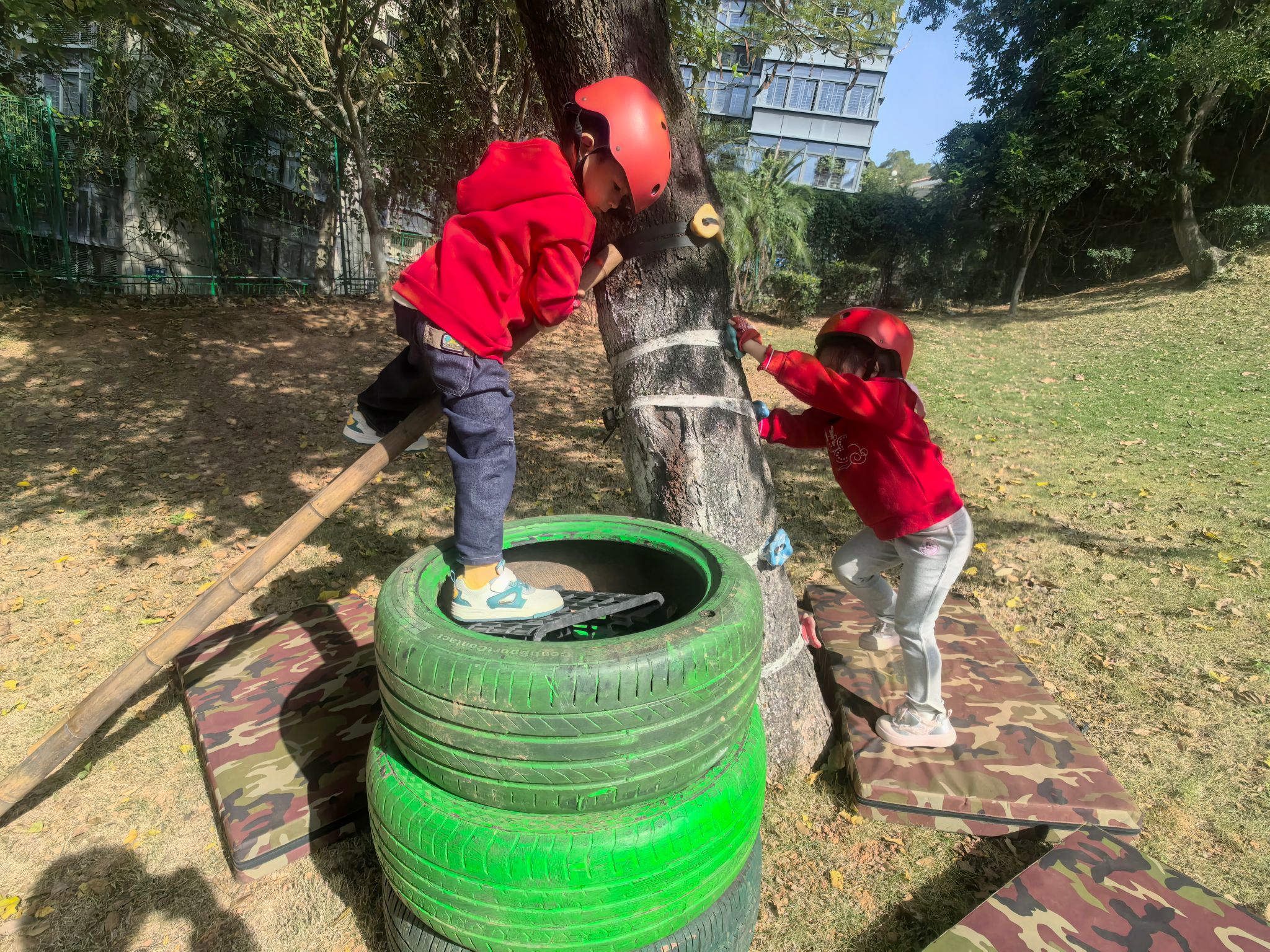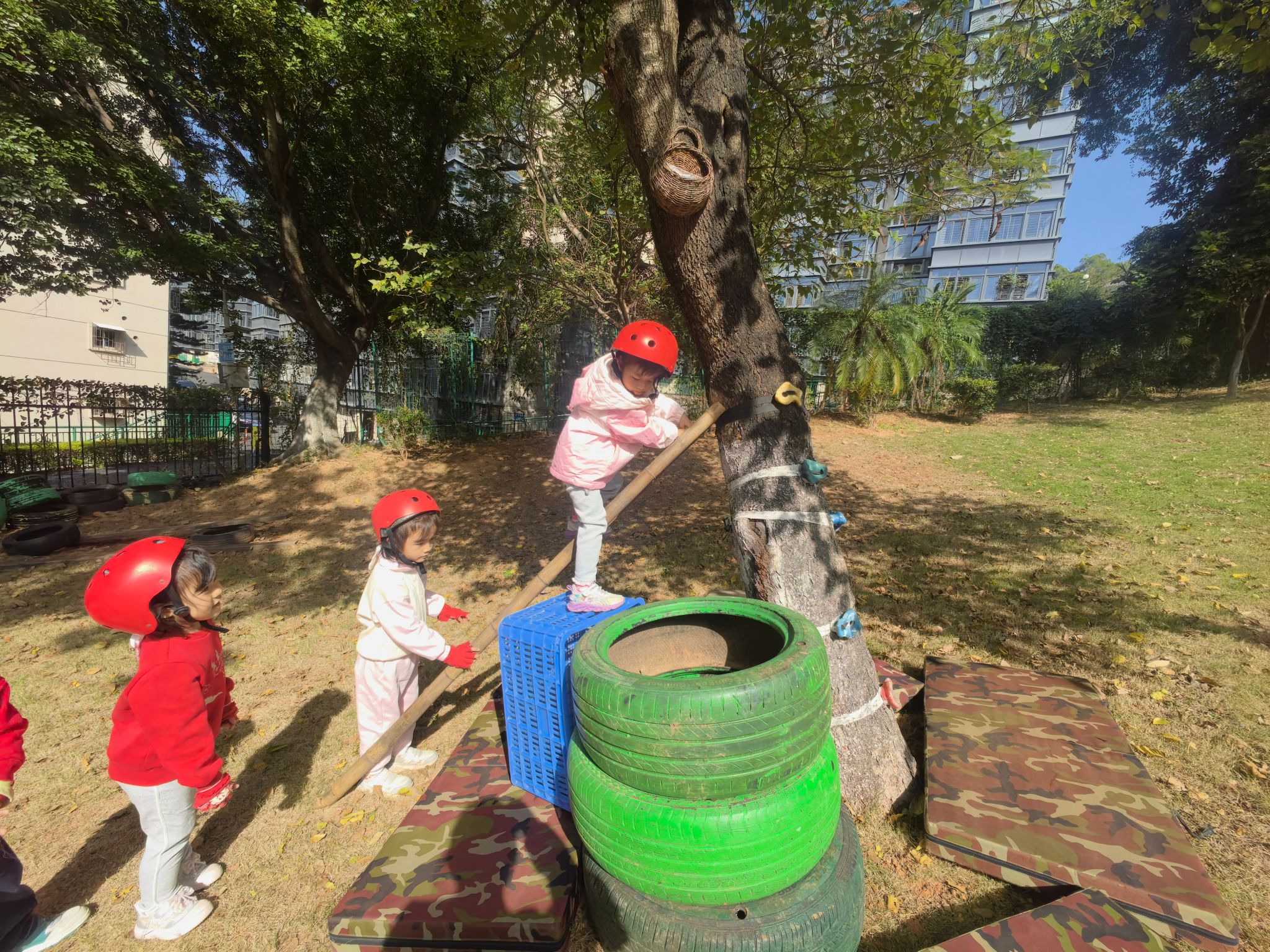 活动前,孩子们化身“小小规划师”,和老师一起讨论爬树场地的布置方案。“梯子要靠稳树干!”“轮胎叠高可以当台阶~”大家七嘴八舌出主意,还主动参与抬梯子、滚轮胎、叠放轮胎、架设安全设施的全过程,在分工合作中锻炼了动手能力和规划意识。